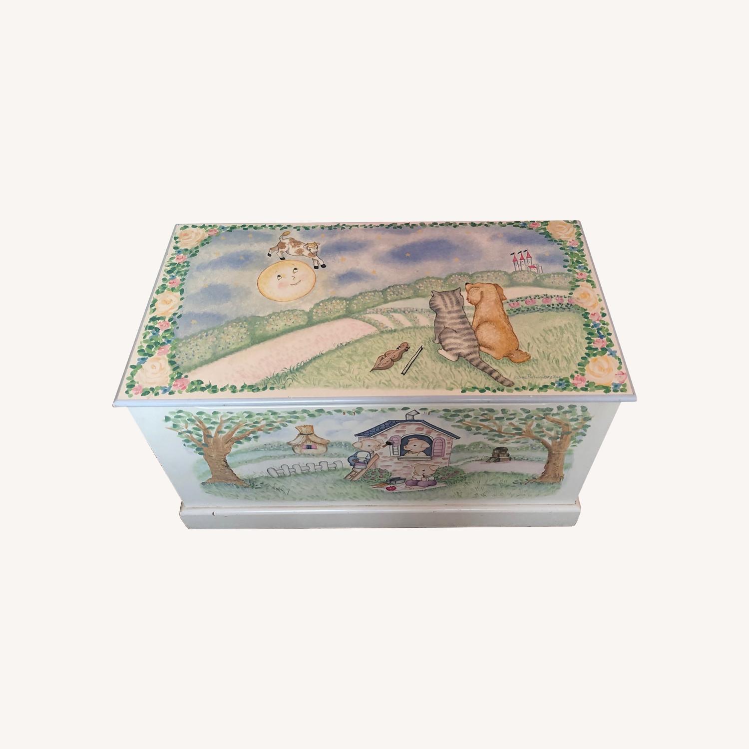 Seller's Notes:This beautiful toy chest features hand-painted scenes from classic Mother Goose nursery rhymes. This works perfectly in a child's room and is a set with other listing we have up (https://www.aptdeco.com/product/hand-painted-hanging-wall-shelf and https://www.aptdeco.com/product/hand-painted-six-drawer-dresser).