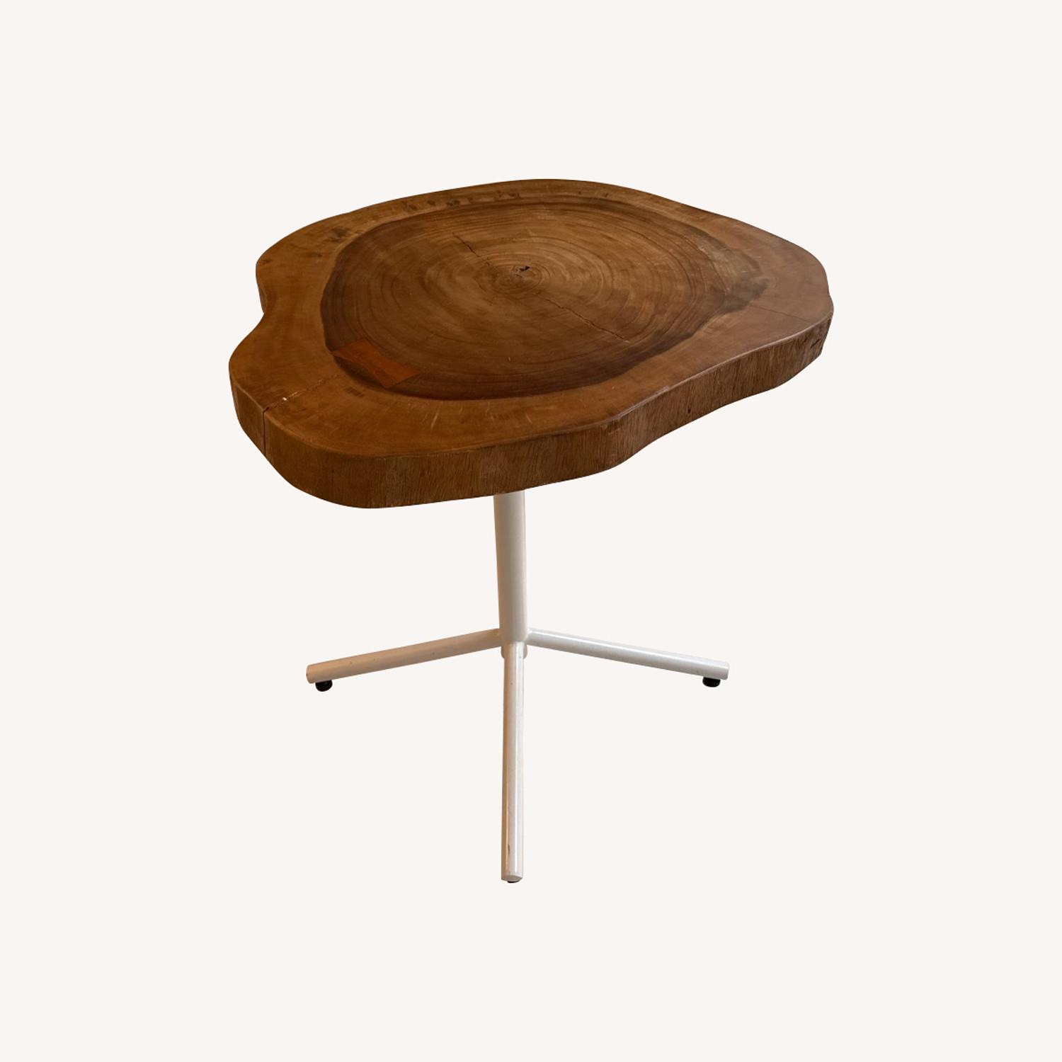 Seller's Notes:This one-of-a-kind table is made from a reclaimed wood slab I personally picked out at From The Source and paired with modern legs. Perfect as a cozy two-seater dining table, a statement side table, or a versatile accent piece. Its organic shape and warm tones bring natural beauty and craftsmanship into any space. I’ve cherished this piece for years, but I no longer have room for it—hoping it finds a new home where it can be appreciated.