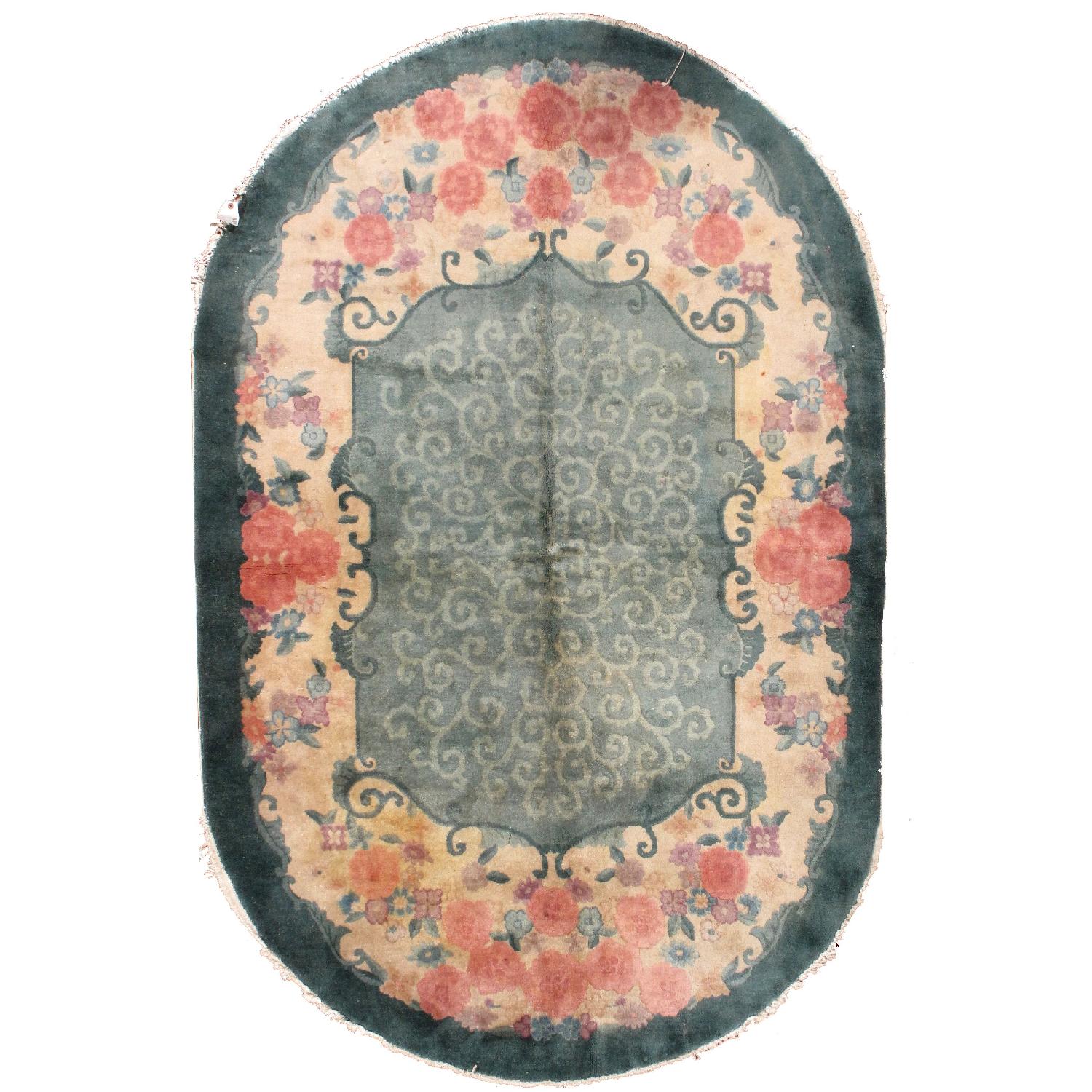 Seller's Notes:Oval Art Deco Chinese rug in original good condition. The rug is in green, rose and beige shades. -condition: original good, -circa: 1920s, -size: 5' x 7.10' ( 152cm x 242cm ), -material: wool, -country of origin: China, -style: Art Deco, -background colours: green, beige, red.