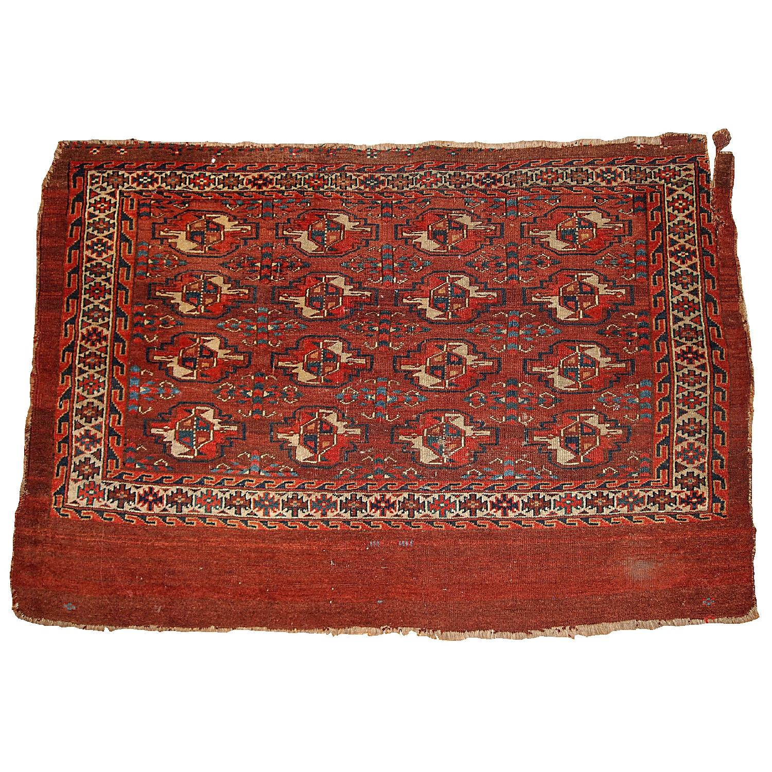 Seller's Notes:Hand made antique collectible Turkmen Yomud rug in burgundy shade and classic detailed design in azure colour. The rug is in original condition, has some damages on the corners. -condition: original, damaged corner, -circa: 1880s, -size: 2.11' x 2.3' ( 94cm x 131cm ), -material: wool, -country of origin: Turkmenistan, -style: Yomud, -background colors: burgundy, brown, red, beige, azure.
