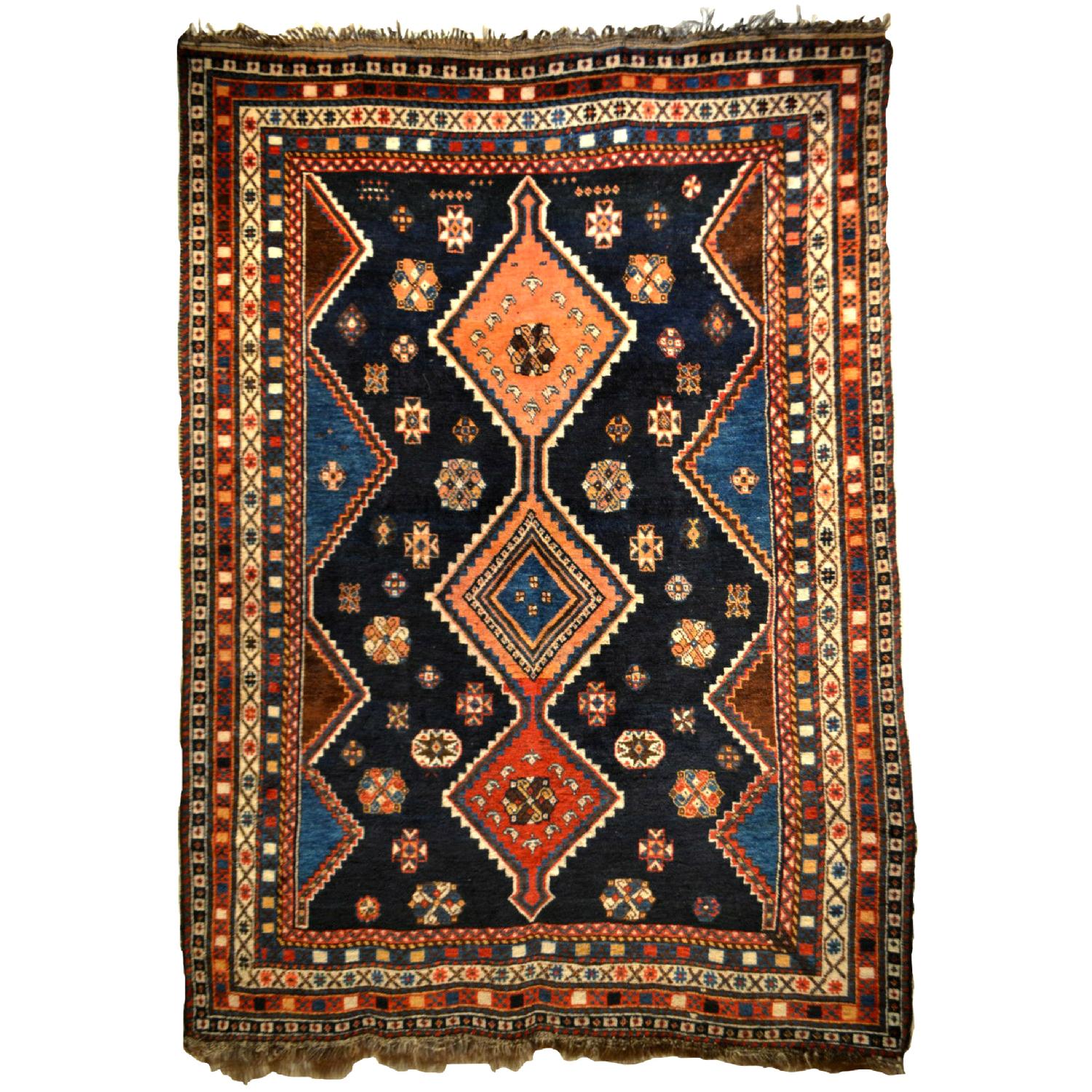 Seller's Notes:Handmade antique oriental rug from Middle East Loristan. This tribal rug is in original good condition, made in the beginning of 20th century in wool. -condition: original good, -circa: 1920s, -size: 5.3' x 7.7' (162cm x 236cm), -material: wool, -country of origin: Middle East, -style: Loristan, -background colours: dark blue, sky blue, orange, red, brown.
