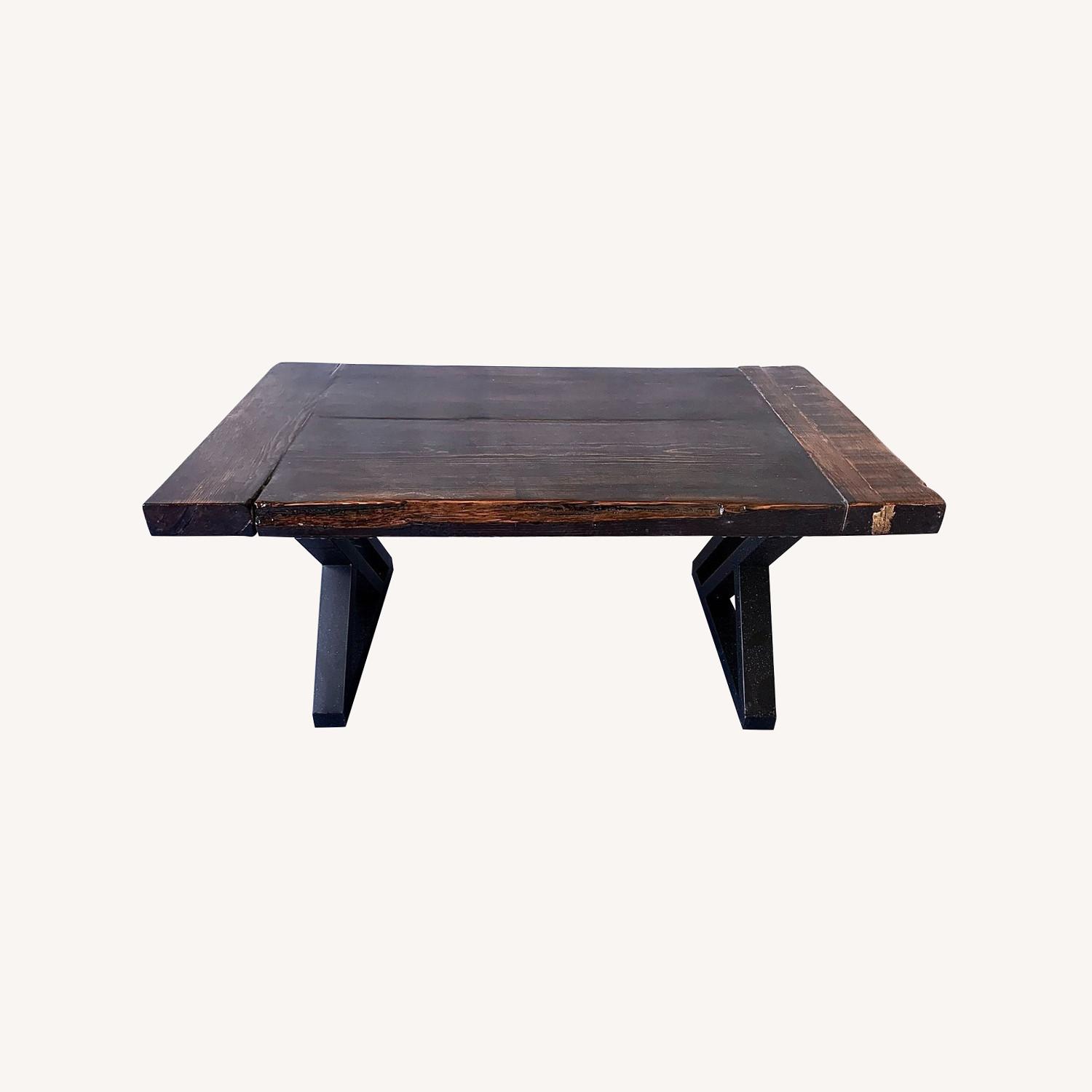 Seller's Notes:This handsome solid wood coffee table was handmade from reclaimed wood that was sourced in Ridgewood, Queens. The table is 39" long, 21.75" wide, and 17.5” tall with the table top measuring at 1.75" thick. The reclaimed wood appears to be a mixture of domestic hardwood and pine and was given an epoxy finish to seal in the original paint, texture, and Jacobean and black walnut staining. The table has black industrial modern metal legs with footing to adjust leveling.