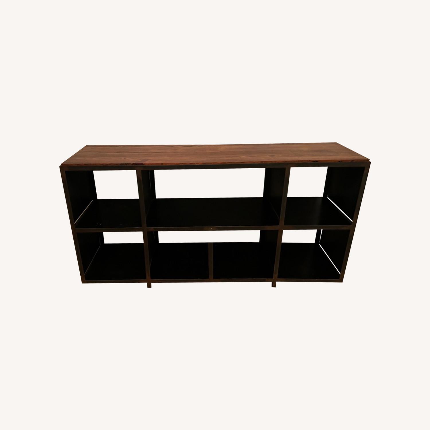 Seller's Notes:This lovely piece was handmade in Brooklyn by a local furniture maker. It’s designed to hold standard records but we used it mostly for books. Great tv stand too! Solid wood top on a metal base. Sturdy and well made with just a few tiny blemishes on top (pictured).