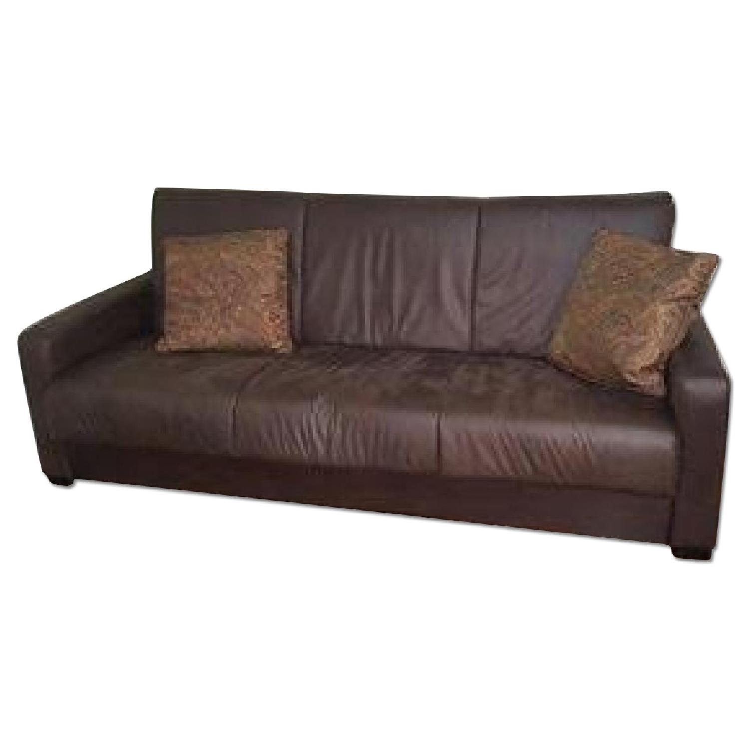 Seller's Notes:Handy Living Convert-a-Couch full-size sofabed. 1 year old, good condition. Small scratch on top and small hole on left couch cushion (both pictured). Faux leather, converts to full size bed. We are moving to LA so we have to get rid of everything! This sofabed is comfy and has been very handy when we have guests at our apartment. It can easily sleep 2 small-to-average sized people.