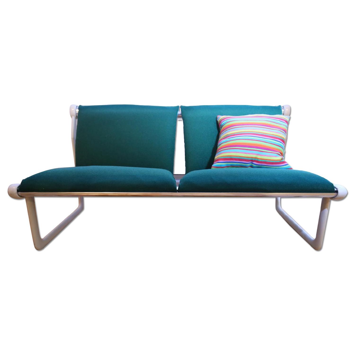 Seller's Notes:This is a modular Hannah Morrison Mid-Century for Knoll Sling settee sofa in original vintage green upholstery, with original label. Inspired by the extruded aluminum of a sailboat mast. A beautiful original vintage 1970’s mid-century modern sling loveseat designed by Bruce Hannah and Andrew Morrison for Knoll. Comes with original vintage Knoll fabric. Extruded aluminum frame and sleek, minimalist lines. Aluminum in great shape. The chairs were made in 1978. They would look amazing in a living room, office, co-working space or studio. Bruce Hannah made a career of understanding and exploiting modern technology and materials to create efficient, practical products. Hannah found a philosophical and creative partner in Andrew Morrison, with whom he introduced several innovative products for Knoll in the 1970s. Exploring the possible applications of aluminum in modern furniture, the pair introduced a lounge seating system in 1971. Hannah taught at the Pratt Institute until his retirement in 2015.