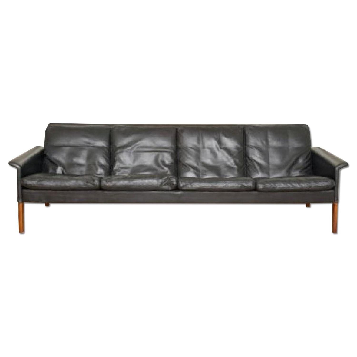 Seller's Notes:Timeless classic with beautiful patina! Hans Olsen 4 seater black leather sofa with rosewood legs 1960 Same sofa, not in such good condition, is offered on 1stdibs for $5400. PERIOD: 20th Century MATERIALS NOTES: Solid Brazilian Rosewood legs, black leather with goose down. CONDITION: Very Good. Original leather with wear consistent with age and use. Leather has been cleaned and conditioned. Please see detailed photos. WEAR: Wear consistent with age and use HEIGHT: 28.5 in. (72 cm) WIDTH: 7 ft. 3.5 in. (222 cm) DEPTH: 30 in. (76 cm) SEAT HEIGHT: 17.25 in. (44 cm)