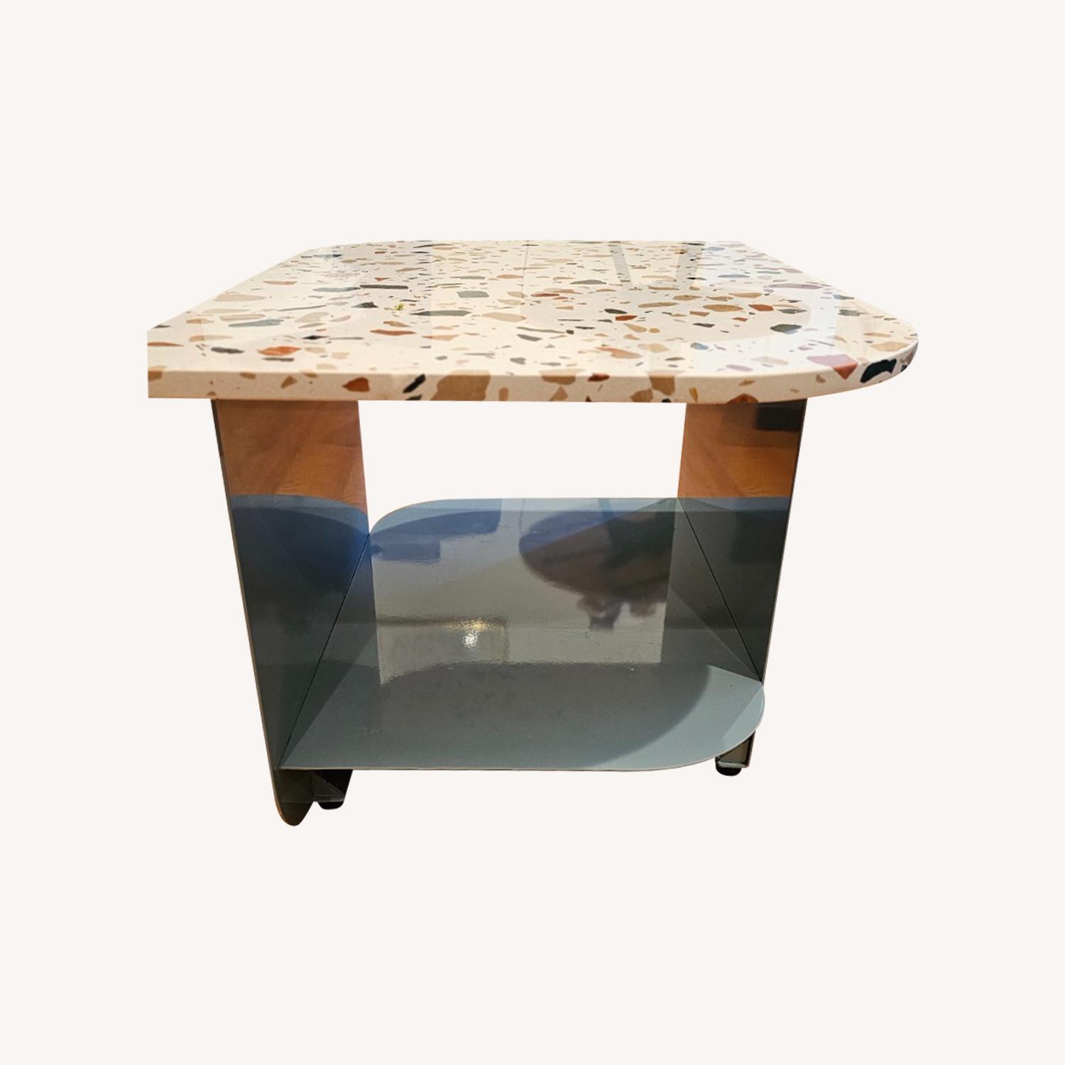 Seller's Notes:Statement Coffee Table - Featuring an iron frame and speckled terrazzo table top - includes and integrated shelf at the base