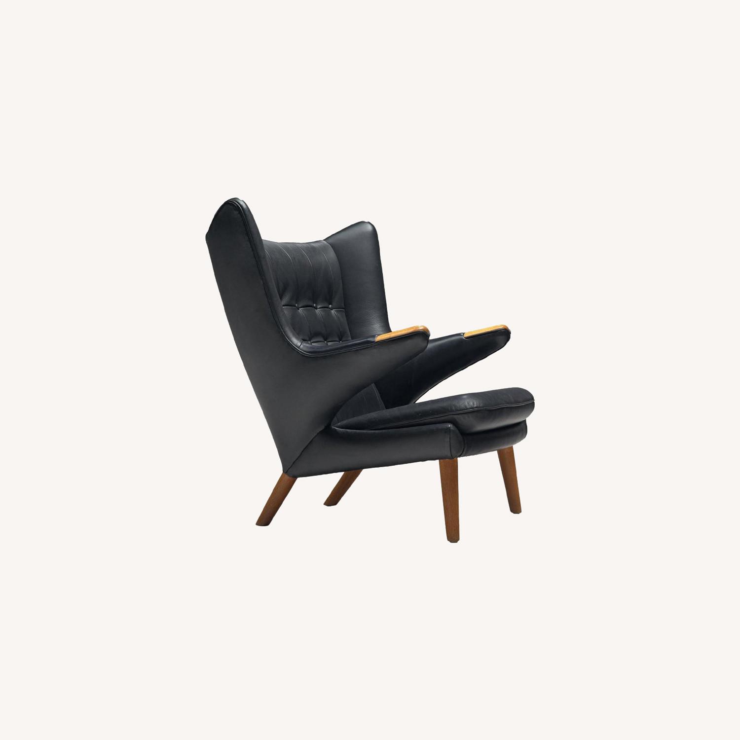 Seller's Notes:DESCRIPTION: One Hans Wegner Papa Bear Chair and One Ottoman **Reproduction** in Black Leather with Walnut trim and legs. Purchased used from AptDeco in 2019. *** DETAILS Dimensions: 36ʺW × 28ʺD × 39ʺH Manufactured 2015: Condition: Original Condition Unaltered, No Imperfections In excellent shape with minimal wear. Includes matching ottoman, also in black leather and walnut. Styles: Mid-Century Modern Designer: Hans Wegner (REPRODUCTION, NOT VINTAGE) Place of Origin: Canada, 2015 Materials: Black Leather & Walnut Seat Height: 14.0 inches Seat Interior Depth: 21.0 inches Seat Interior Width: 20.0 inches