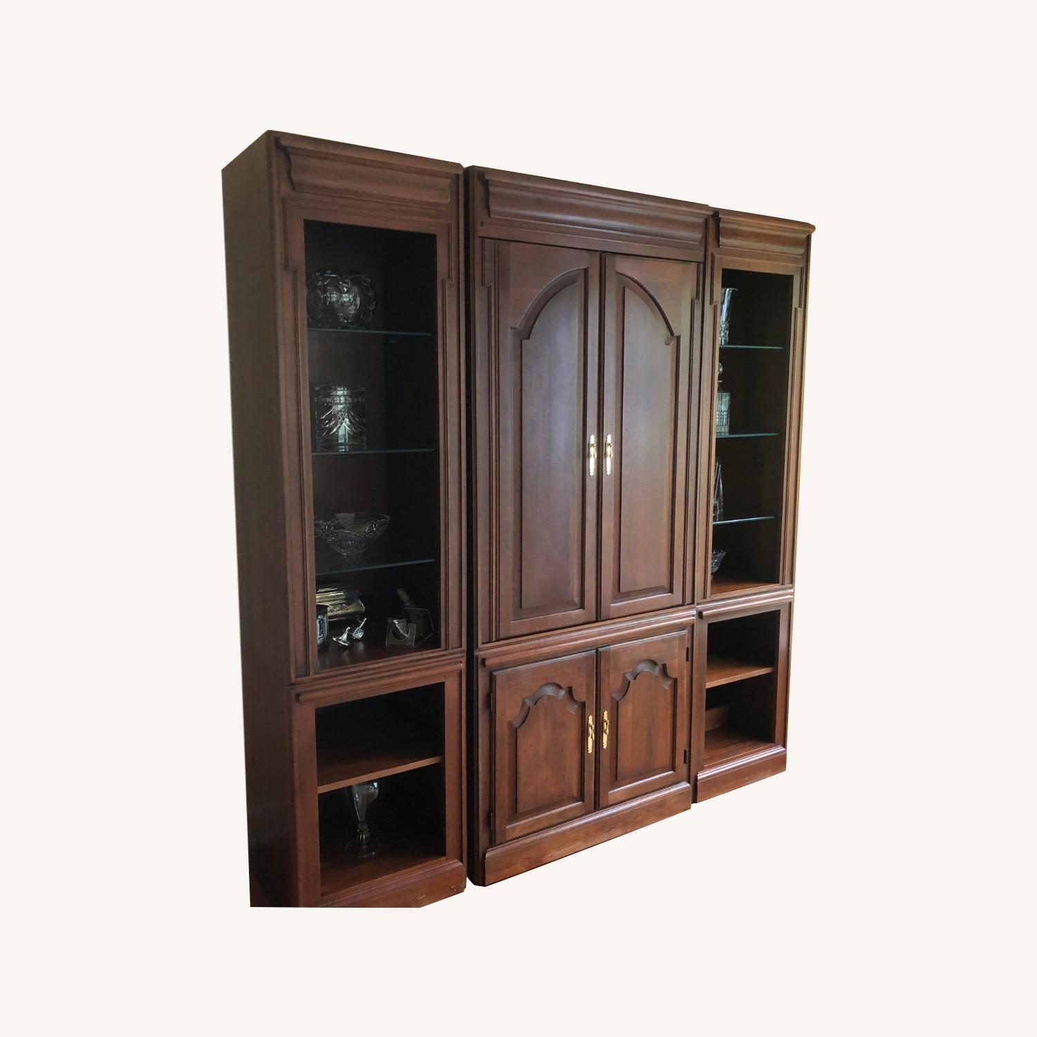 Seller's Notes:This item is in immaculate condition. It is solid cherry wood and made by a very high end manufacturer in NY. Two glass shelves on upper shelves are lighted from the top. There is a turntable to tilt a TV left or right in middle cabinet for better viewing and two additional shelves in lower unit for cable box etc. It separates into 3 separate pieces all totally finished. Side shelf towers are each 20 x 21.5x 80" high and TV cabinet is 23 x 34x 80" high. There is particle board in the back of the entertainment unit in the middle that we opened the cut out to allow for a older deeper TV. This opening would be hidden by any flat screen or could be easily replaced. This is the only issue. Live in single family home. Unit just returned from storage. Price negotiable if pick up. Make an offer! Free delivery to anyone in Apt Deco service area. Single family home-no steps or elevator easy pick up in u haul van or truck