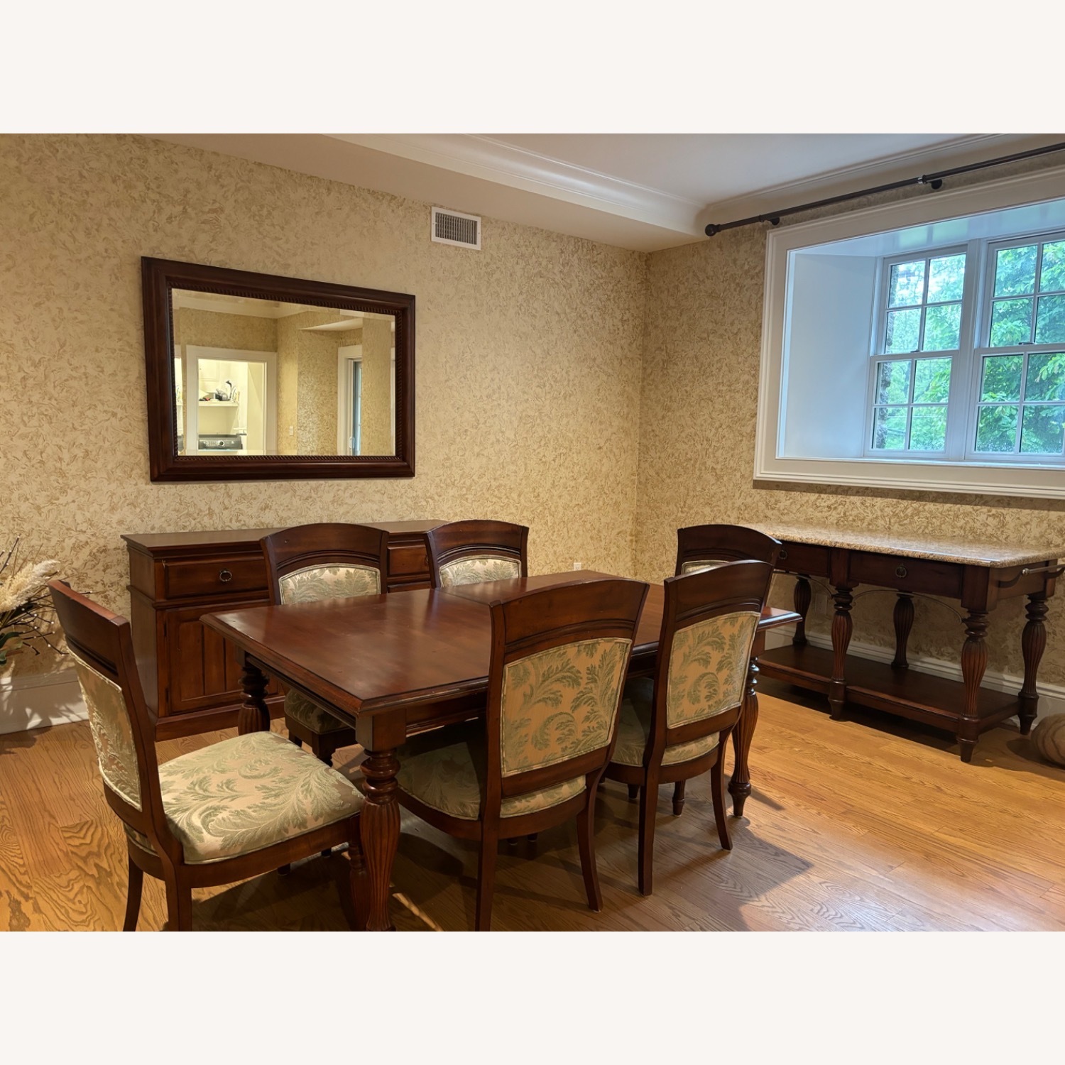 Seller's Notes:Gorgeous Harden Dining Set. Dining table comes with two extension leaves, six upholstered chairs, and two matching arm chairs (not pictured). Matching sideboard, mirror, and granite top server listed separatley.