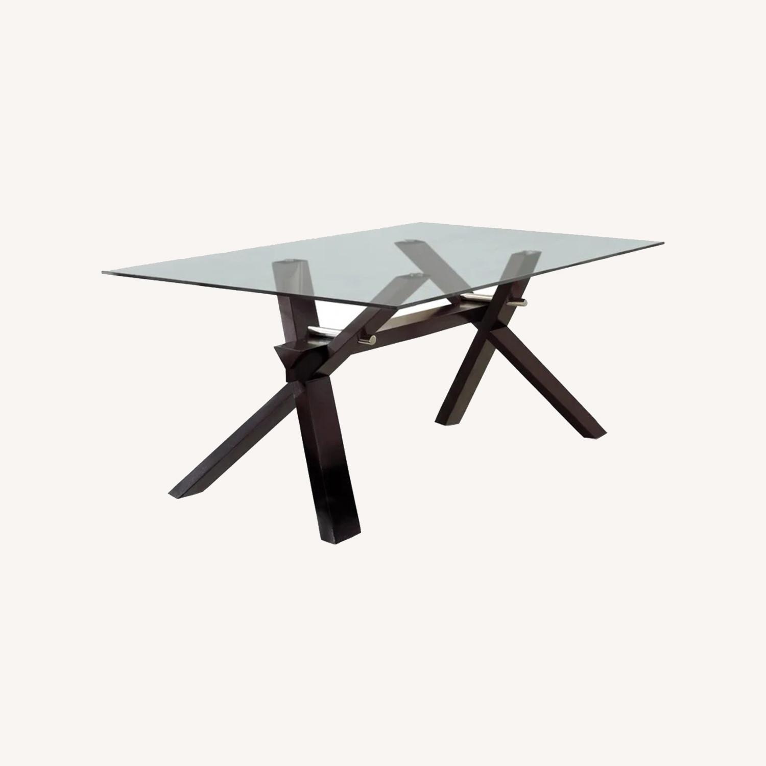 Seller's Notes:Crafted from a blend of wood, it showcases a trestle base awash in a neutral dark espresso cherry finish. Up top, the glass tabletop strikes a rectangular silhouette and accommodates up to six.