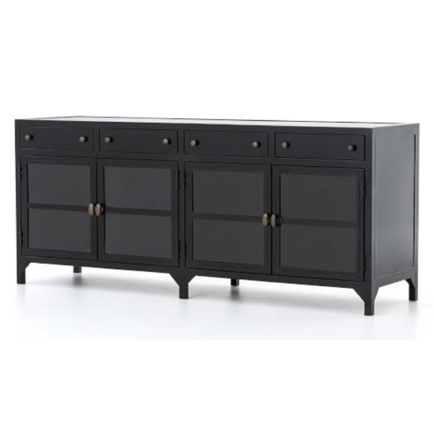 Seller's Notes:Beautiful welded black metal sideboard that could be used as either a media console or even just a bookcase! Tempered glass door fronts paired with inside shelving make for the perfect display center. Top drawers for storage with antique brass knobs. Cutout in back of cabinet for organizing cords etc. Less than a year old. It hardly gets touched in my living room, so it's in pretty perfect condition.