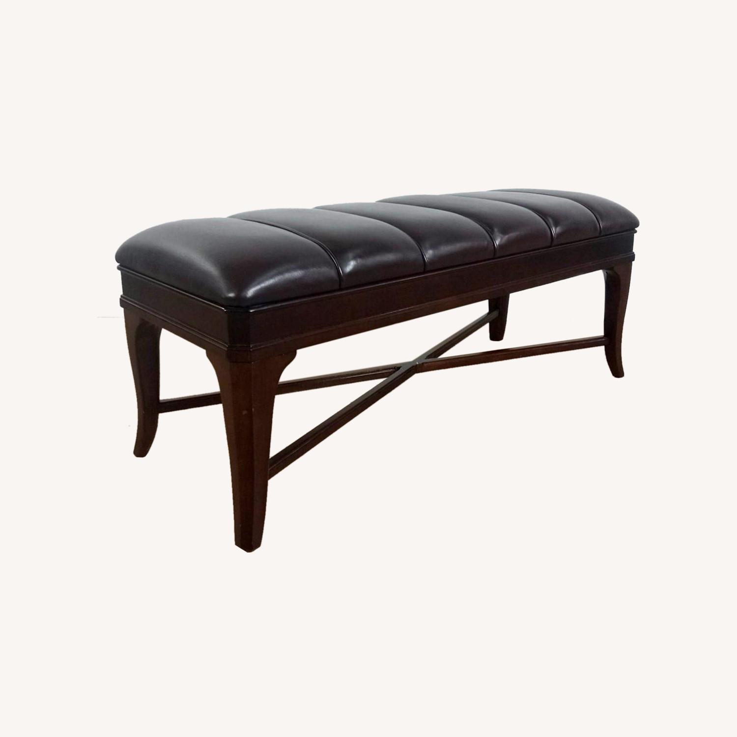 Seller's Notes:Description: Transitional Style Solid Wood Bench With Padded Leather Look Channel Row Upholstered Seat. Brand: Haverty's . Material: pleather,wood. Seat heigt: 20. Gently used - any blemishes or damage will be included in the photos. #SKU: 3000612. Tags: pleather,wood,traditional