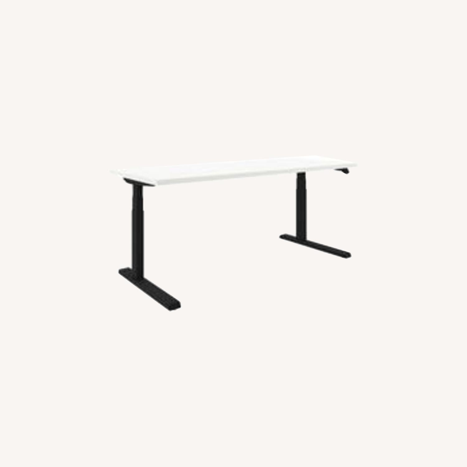 Seller's Notes:" Sit to stand White laminate top Black metal legs White clamp-on unit 2 gpo 2 USB White control rail (dual-sided) "