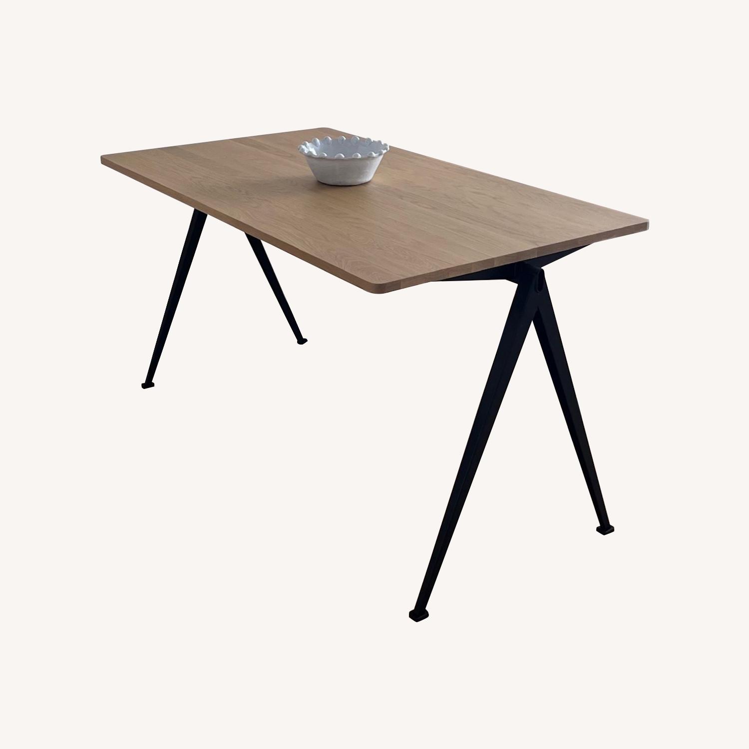 Seller's Notes:Black steel frame and solid oak tabletop. versatile enough to serve as dining table (4) or desk.