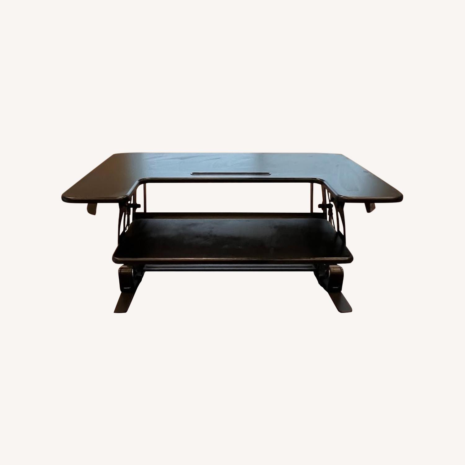 Seller's Notes:Quick Sit-to-Stand dual monitor raiser on top of an existing desk.