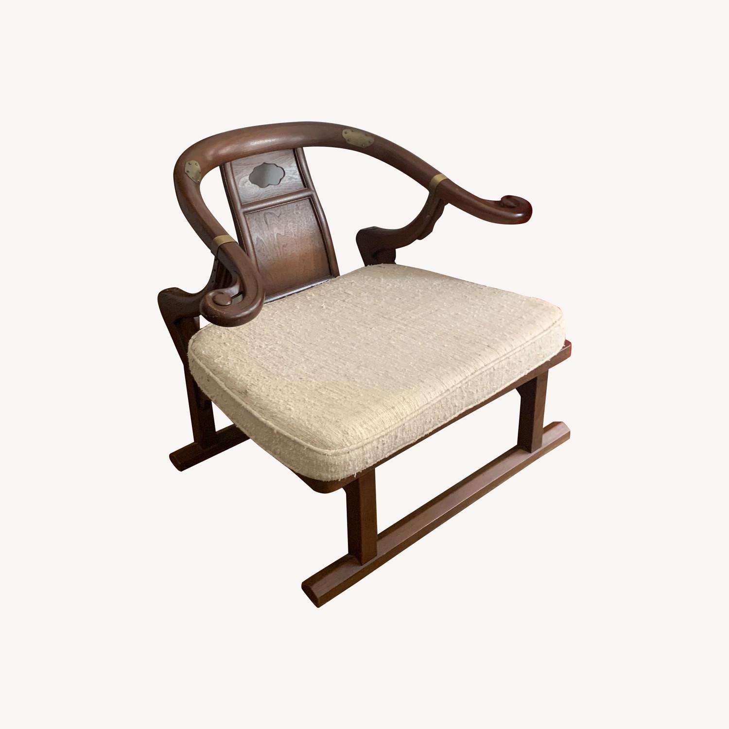 Seller's Notes:Vintage mid-century chair salvaged from Texas. White, removable bouclé cushion with a zip cover. Beautiful asian-influenced wood carving and metal accent pieces.