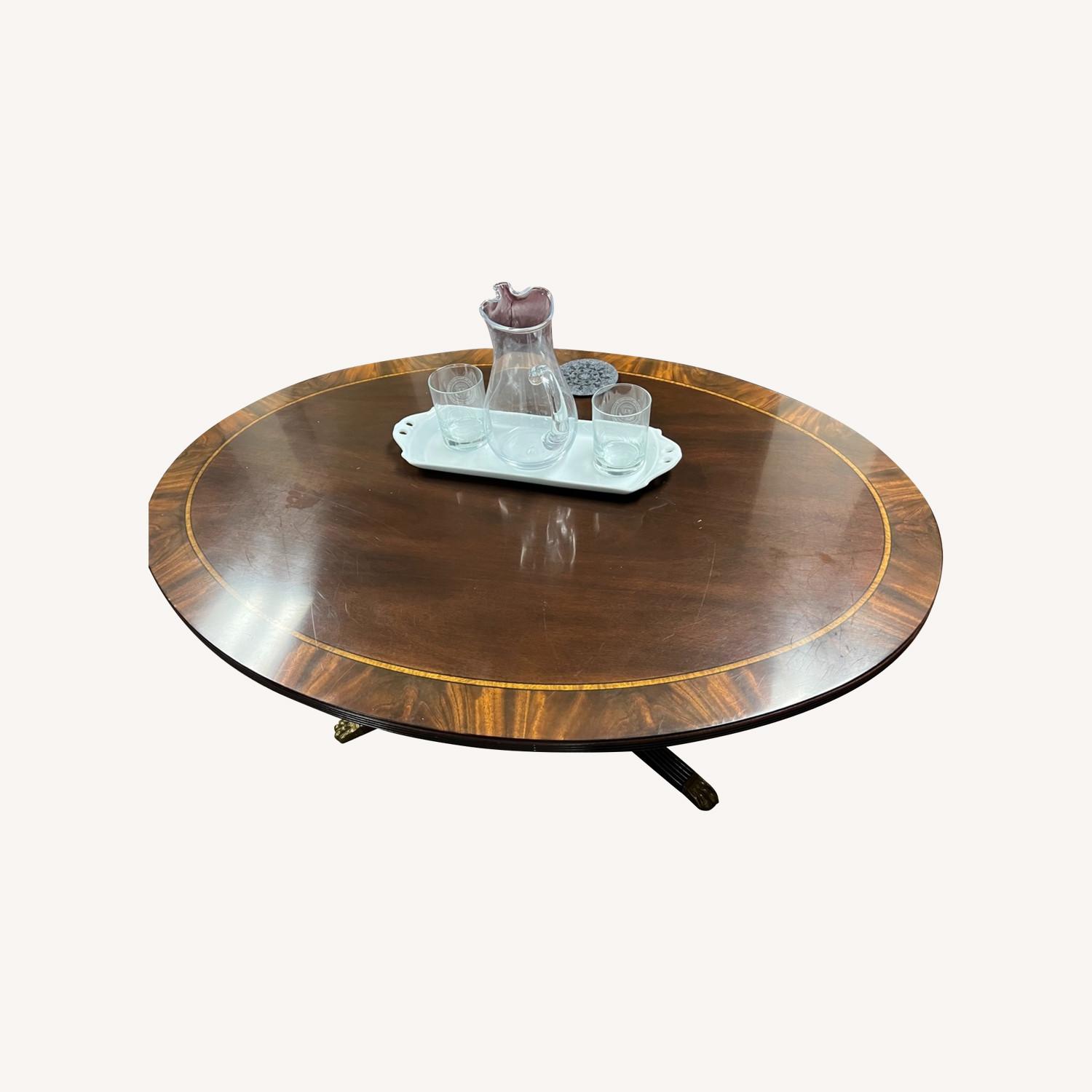Seller's Notes:What a find! This elegant oval coffee table with reeded edge, satinwood inlay and and brass capped lion's paws would look gorgeous in your home.