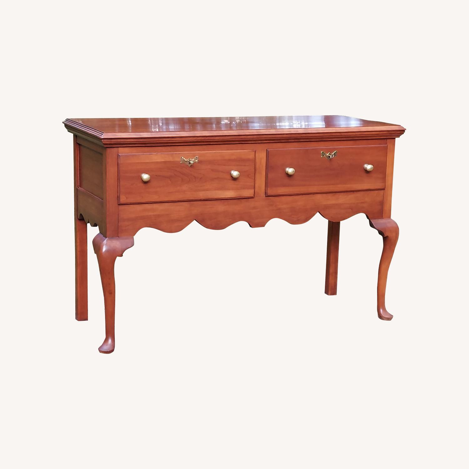 Seller's Notes:Late 20th century Queen Anne style traditional Colonial two-drawer sideboard with fitted silver tray and hidden document compartment. You have to completely pull one of the drawers out to access the document box which is situated between the drawers inside the piece. I was told by the last owner this was an optional special feature. The piece is very clean and in excellent condition. Working locks and includes key.