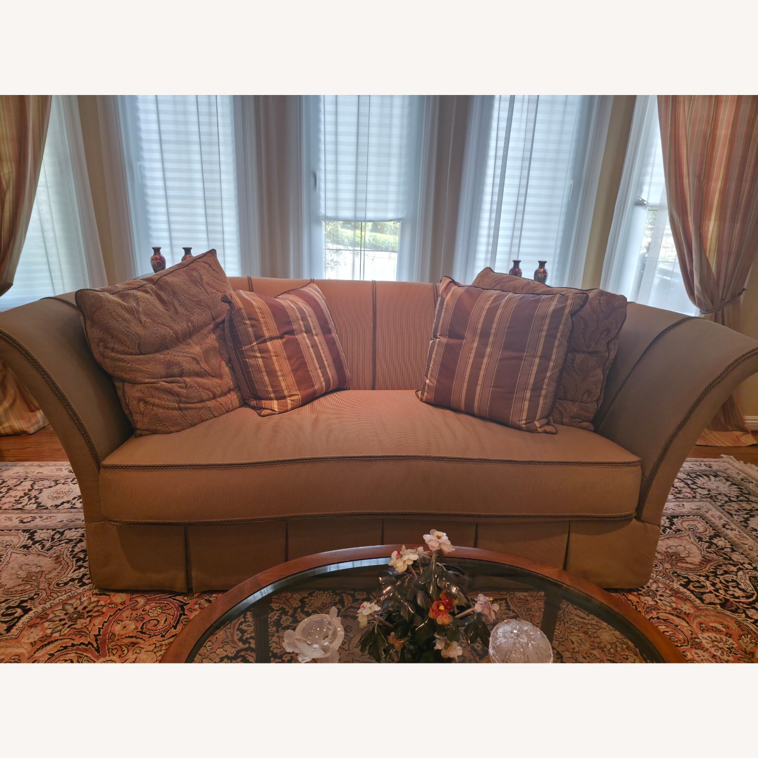 Seller's Notes:Barely used - no stains or tears. Double trim on outside / inside. Dressmaker flounce - buttoned outside back.