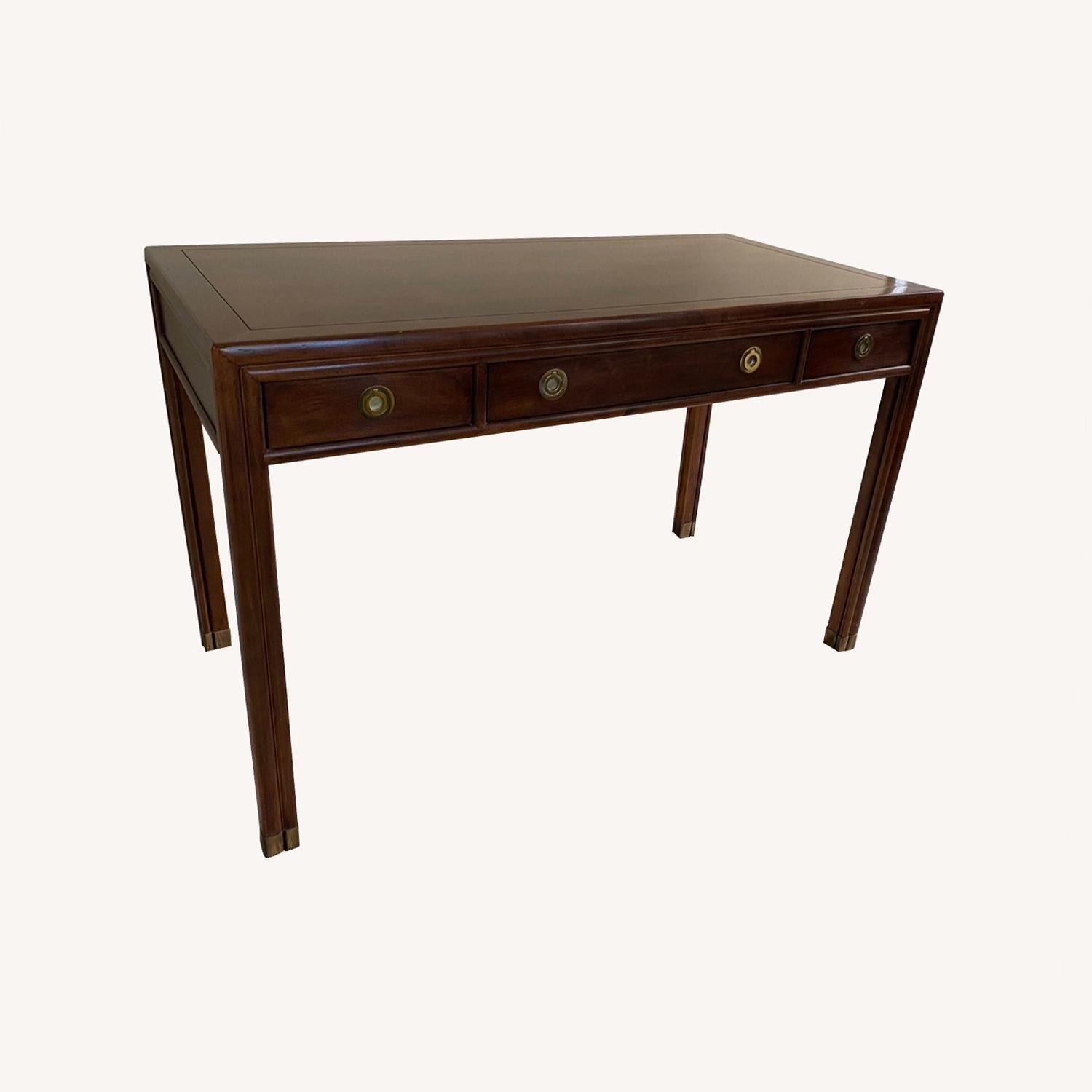 Seller's Notes:Henredon wood desk with metal detailing at feet and three drawers.