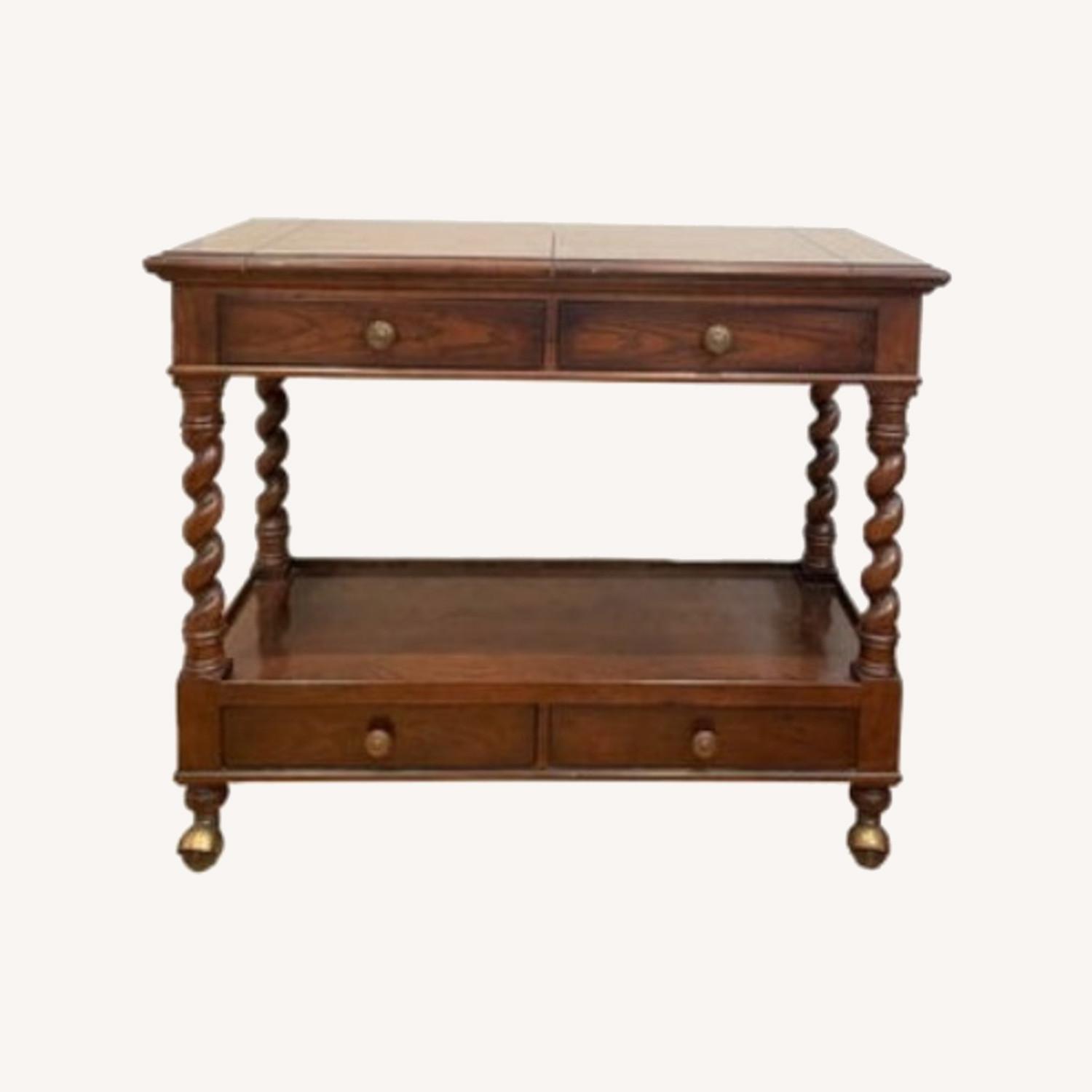 Seller's Notes:Henredon Four Centuries English Oak Barley Twist Flip Top Buffet Fantastic server made of solid oak with barley twisted legs and brass capped wheels made by Henredon from their Four Centuries collection. It has 4 dovetailed drawers that all slide as they should. The top flips open and closed as it should. In excellent used vintage condition. Measures 39 3/4" wide, 18" deep, and 32" tall when closed. When open it is 59 1/2" wide