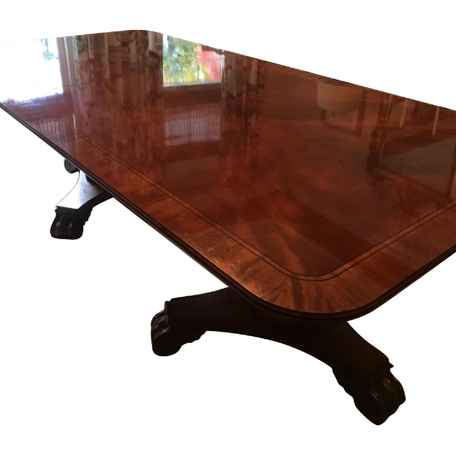 Seller's Notes:Elegant Henredon Natchez Dining Room Table that extends from 76 inches to 97 inches or 118 inches with 2 leaves.(21 inch leaves) Comfortably seats 8-12. The table has two pedestals and the feet are large and beautiful. Purchased in 2000 for $8000 Selling for $2,000. Mahogany with inlay. Great Condition. Slight imperfections on pedestal base-see pictures below