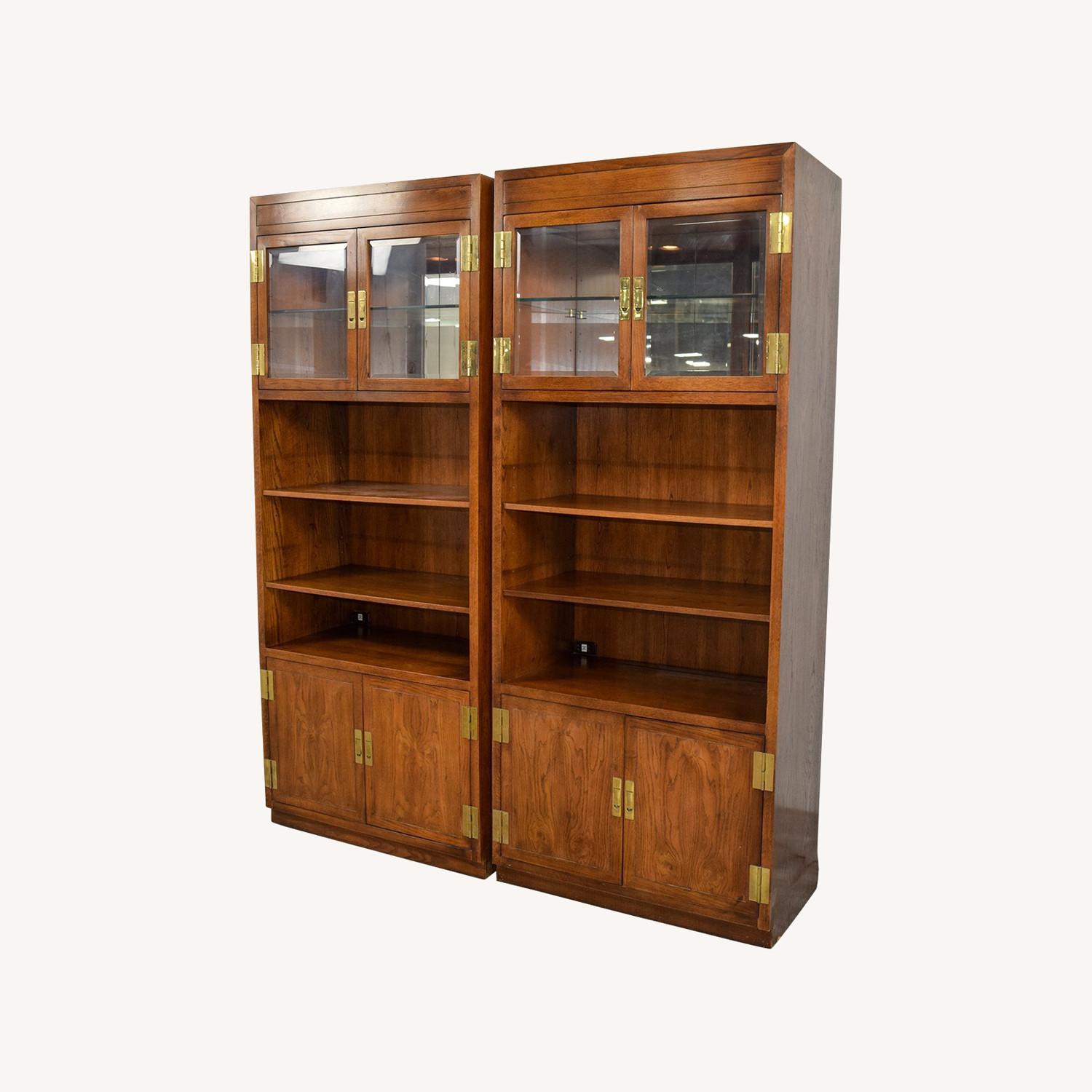 Seller's Notes:HENREDON "Scene One" Campaign Oak THREE Piece Lighted Wall Unit / Bookcase / Étagère. These handsome case pieces have brass hardware, interior lighting, built-in outlet capabilities, and lots of storage. Each piece is 35" W x 84" H x 18" D. Overall condition is great with gentle wear, and one section of one of the pieces has come ajar (See photo. This can easily be nailed back in or drilled on tightly). Please inbox with any questions!