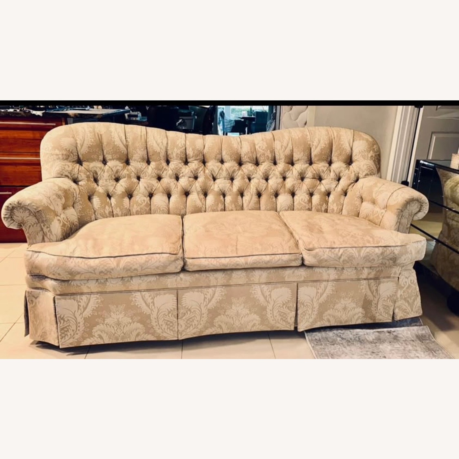 Seller's Notes:Fine estate furniture from the Henredon "Schoonbeck Collection." Traditional, often Louis XV-inspired. Sofa in excellent vintage condition from smoke and pet free home. Very clean piece ready for placement in your home! The original upholstery is a soft yet sturdy, light cream damask fabric. Three down filled, double sided upholstered cushion with piping. Back is tufted and curves seamlessly into the rolled, tufted arms. Has a crescent shape, unique curved back, upholstered in a rich beige damask fabric, spring couch finished with classic, inverted box-pleat skirt. Carved Wooden Legs in Natchez Finish, mahogany with natural enhanced finish. Height: 36 in (91.44 cm) Width: 77 in (195.58 cm) Depth: 36 in (91.44 cm) Seat Height: 17.25 in (43.815 cm) Seat Depth: 23.5 in (59.69 cm) Leg Height: 7.75 in (19.685 cm)
