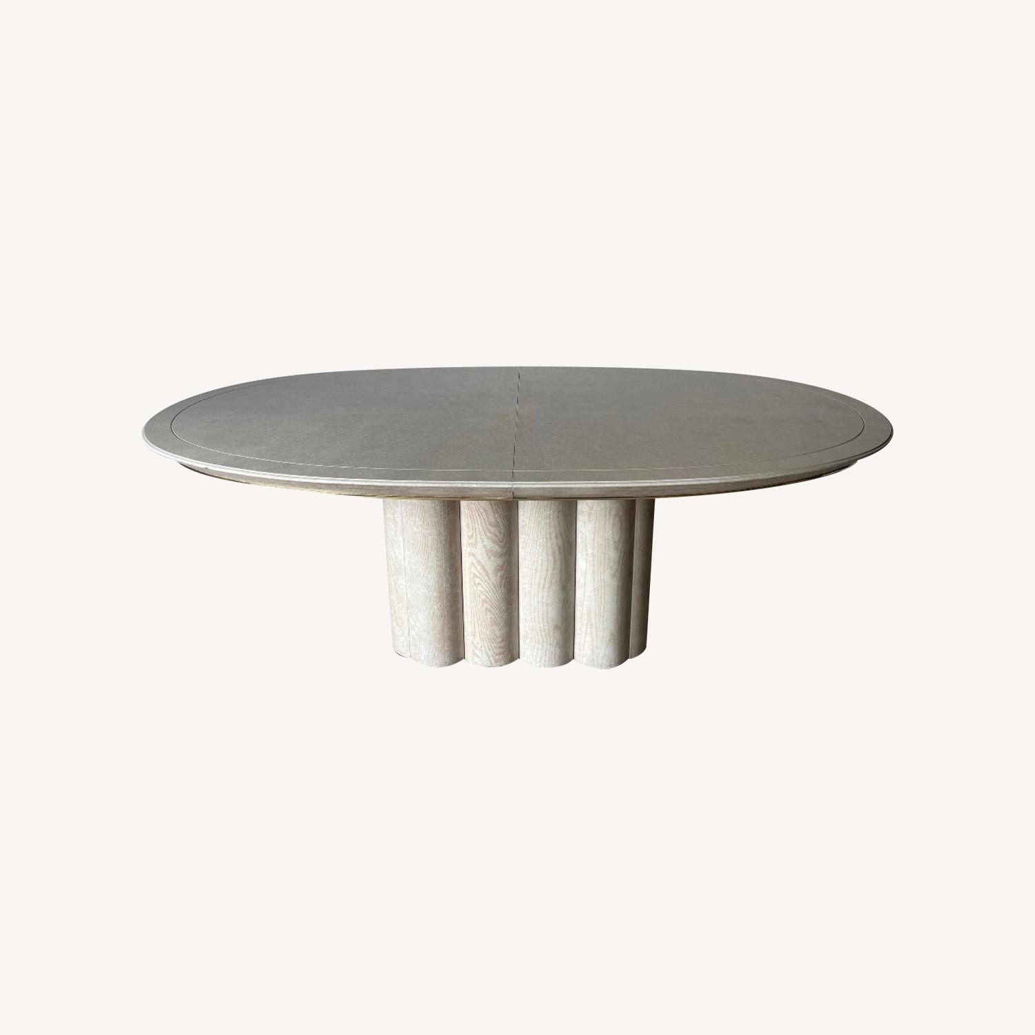 Seller's Notes:Stunning Vintage sculptural organic Modern dining table by Henredon. Features beautiful design, oval top with accent gold/ brass detail around the top rests atop an sculptural wood base and finished in a cerused finish. Measures: 80.0" w x 44.0" d x 29.0" h / Inches In good vintage condition with typical wear/ marks in some areas. Please see all photos for additional details.