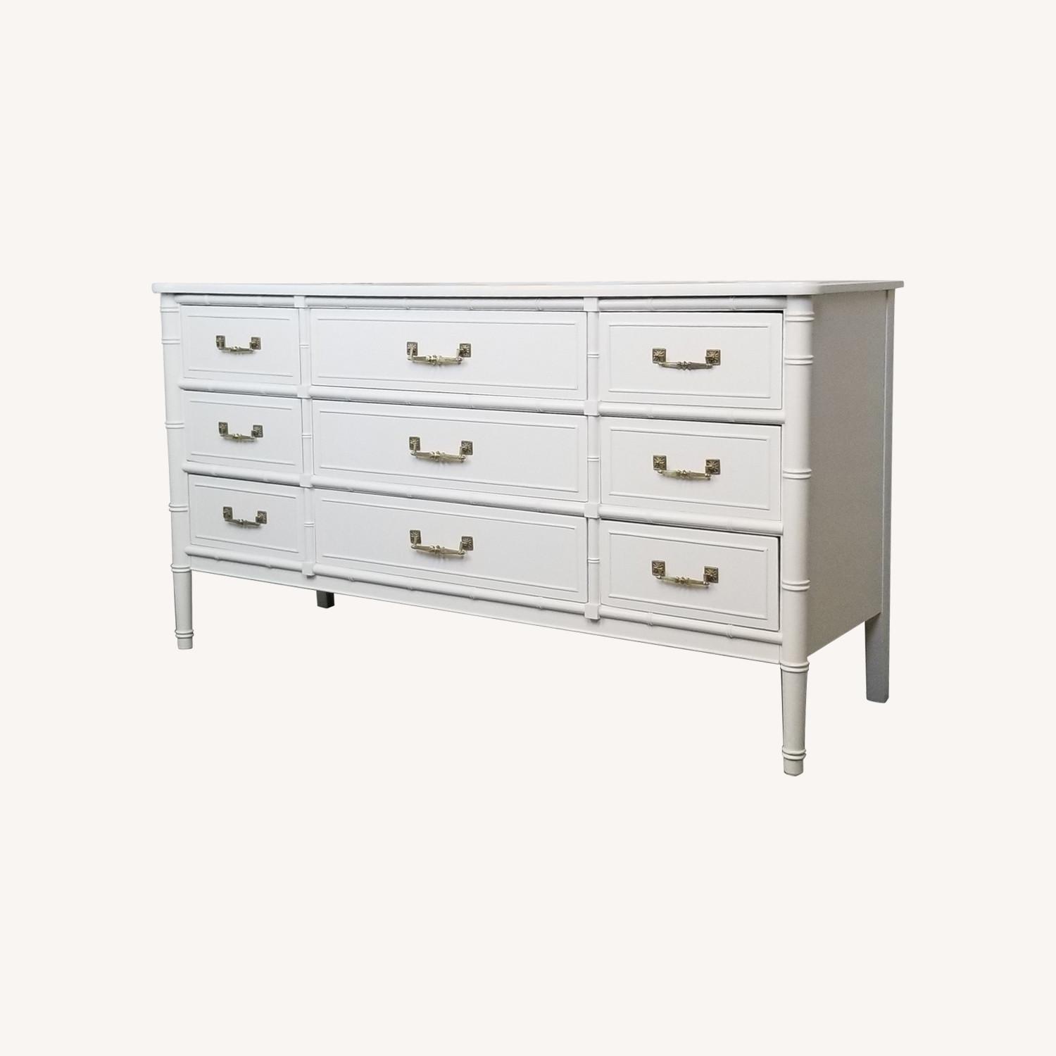 Seller's Notes:Beautifully refinished Vintage Bamboo dresser. Highly sought Bali Henry link vintage dresser for a reasonable price!. Refinished into a soft white and accented with polished brass original hardware. Dovetailed drawers, well made. A versatile piece of furniture, perfect accent piece in your bedroom, a gorgeous changing table in your baby's nursery, tv stand or unique sideboard for a designer dining room! I am an interior decorator that takes quality vintage furniture and redesigns them into high-end designs without having the high-end ticket price. Snatch it up before its gone!! Check out my reviews on Etsy under Renovista. Support your local artisans!