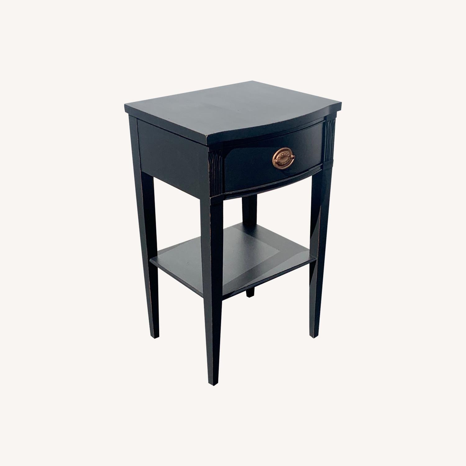 Seller's Notes:Delicate and small, this handsome hepplewhite style nightstand it the perfect accompaniment to your bed! Featuring a single drawer with original hardware and a shelf below. It has nicely tapered legs. The drawer front has a gentle curve. Refinished in a black color with blueish undertones. the edges have been slightly distressed. The original hardware has been updated with a copper gilding wax.