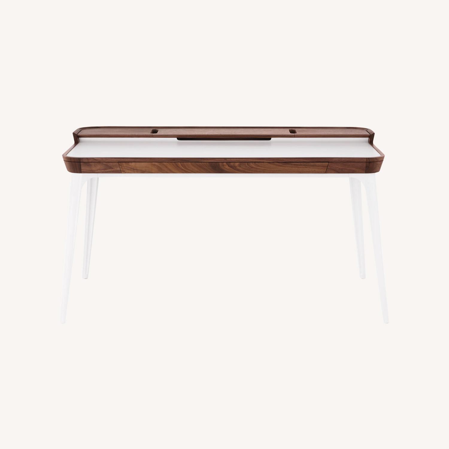 Seller's Notes:Well-thought-out and comfortable to work on, the Airia Desk (2008) uses clever storage and visual cues to keep you organized and focused. A white laminate inset on the desk's surface delineates workspace, while a slightly elevated secondary surface provides a place for books, office tools, and refreshments. Three removable covers with cutouts store and route cords and cables. Keeps clutter out of the work area; laminate insert focuses user’s attention. Slightly elevated back doubles as a shelf. Integrated cord management. Walnut frame and aluminum legs. Minor scratches on the Walnut removable cover where you can store your cords and some minor scratches on the aluminum legs. Overall, this is a quality piece of furniture with solid walnut accents.