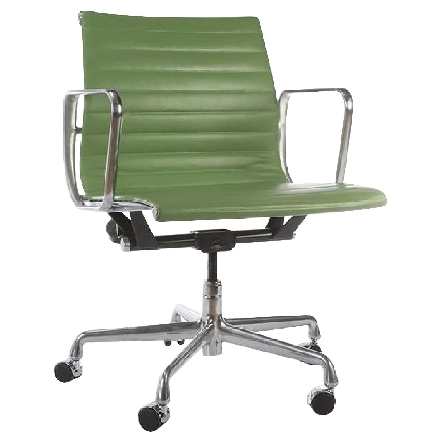 Seller's Notes:The iconic Herman Miller Eames Aluminum Management Chair in a unique green. There is some minor discoloration of the leather and a few scratches on the metal due to normal use, but this beautiful piece will last for many more decades. Stylish, highly functional and gorgeously crafted. The edge of the left armrest has some scratches (see pic).