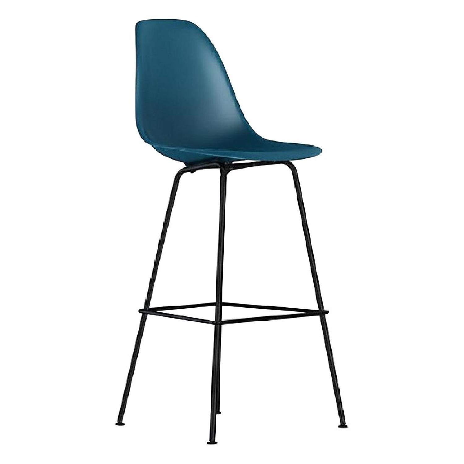 Seller's Notes:Ideal for casual entertaining at a counter or high dining table, these gorgeous hip Eames Molded Fiberglass Stools in electric blue offer the opportunity to mix and match. Designed by Charles and Ray Eames, the counter stools combine a retro modern low-profile back curving into a generous seat. Powdercoated matte black metal legs add a sleek, monochromatic look while providing ultimate stability. The Eames Molded Fiberglass Stools are Herman Miller exclusive. Brand new, unwrapped .For normal cleaning, clean with a soft, dry cloth.