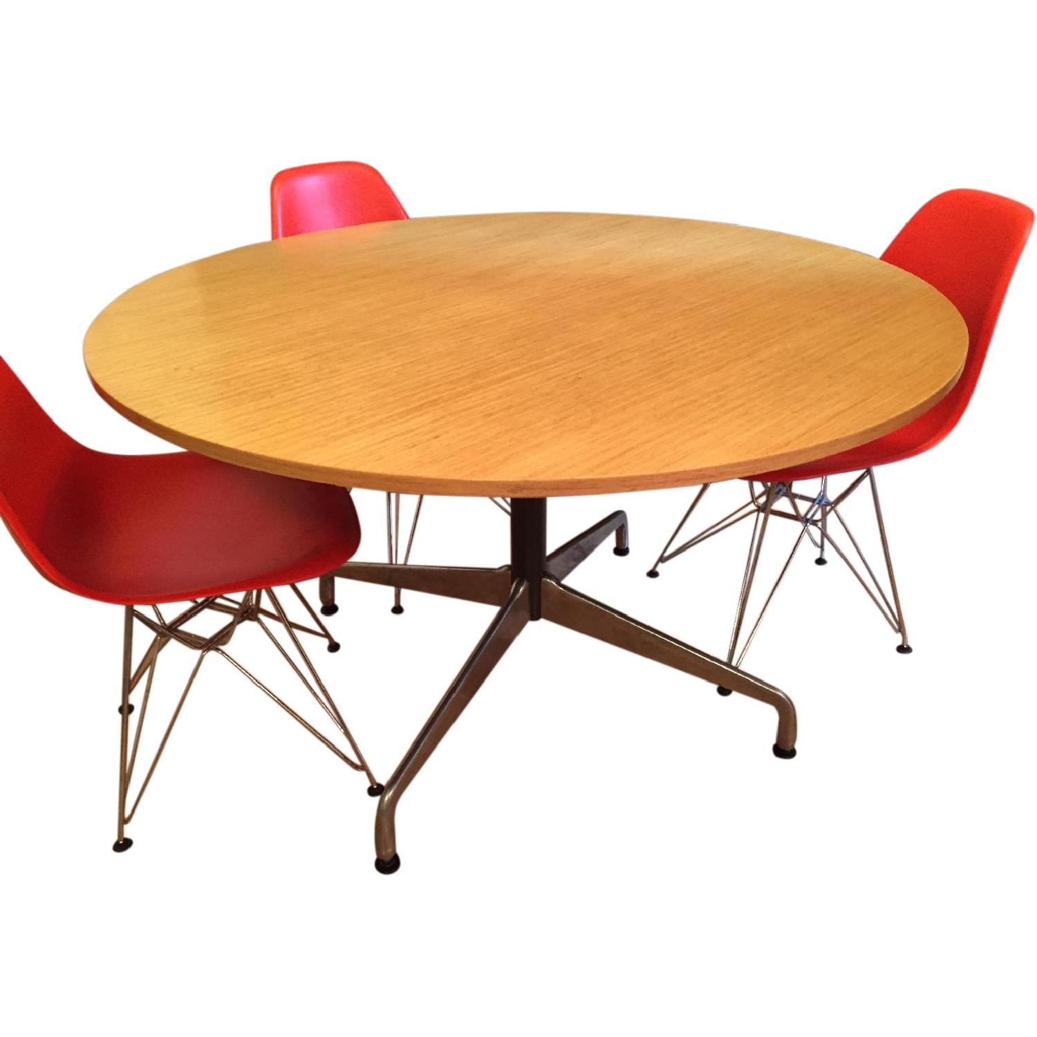 Seller's Notes:Authentic Herman Miller Eames round dining table - 48" Diameter Purchased in 2002 from DWR Made in USA Top: Light Ash Base: Black tubular steel and polished aluminum Top has marker spots and 2 small chips - see photos and shows some moderate wear. Overall this table is in VERY good condition considering its age. Chairs/benches not included. From a pet free / smoke free home.