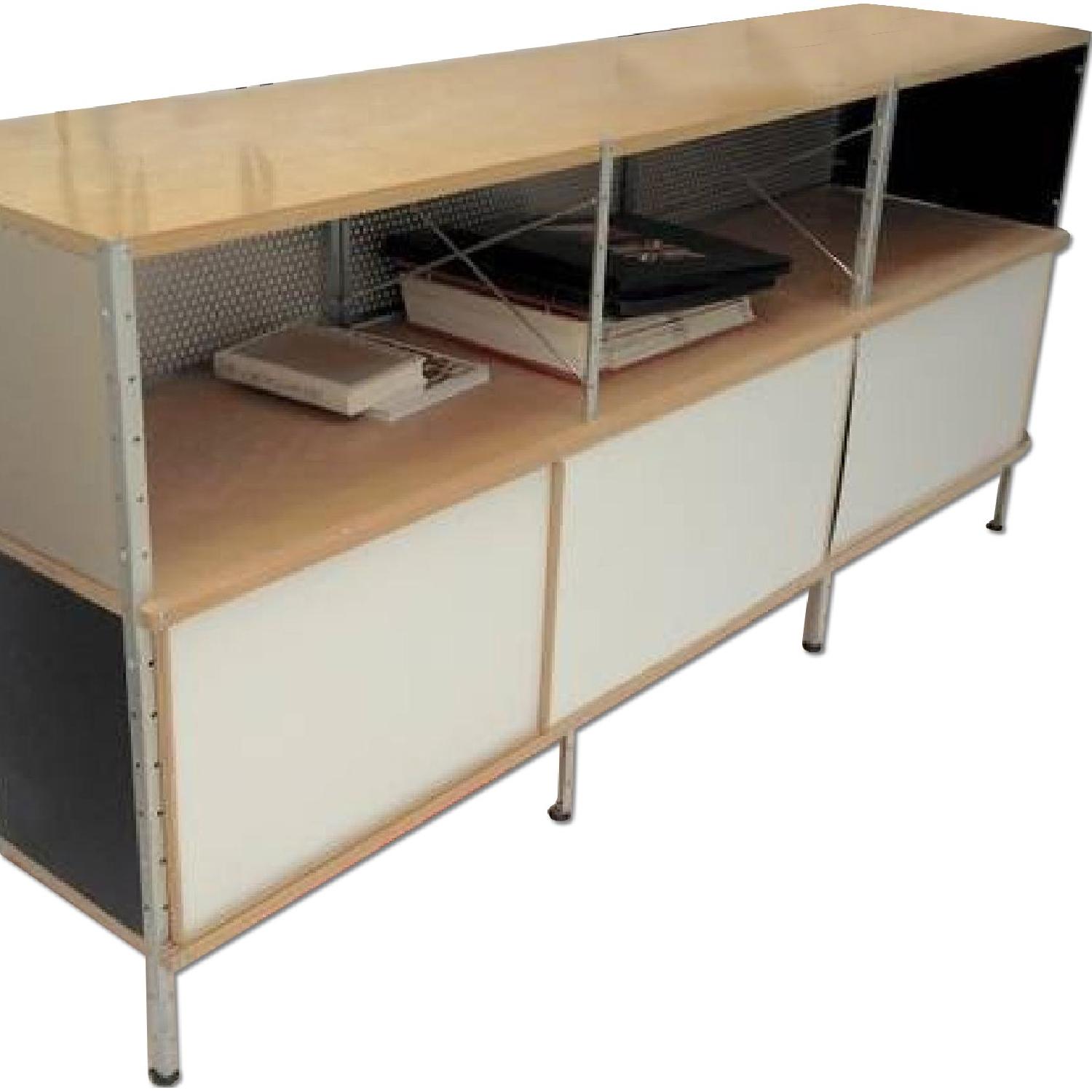 Seller's Notes:Herman Miller produced by Modernica from the late 90's -- I purchased and am the sole owner. Some slight wood discoloration from age, but that what makes it look good in my opinion! Custom made to my specs- 3 units wide, 2 units tall. Sliding Doors on bottom. Perforated metal panels on back side top, color panels on sides- including the rare "greige", grey and black An amazing piece and unfortunately i wont have space for this in my new apartment. Bummer. 70.25" wide x 32.5" tall