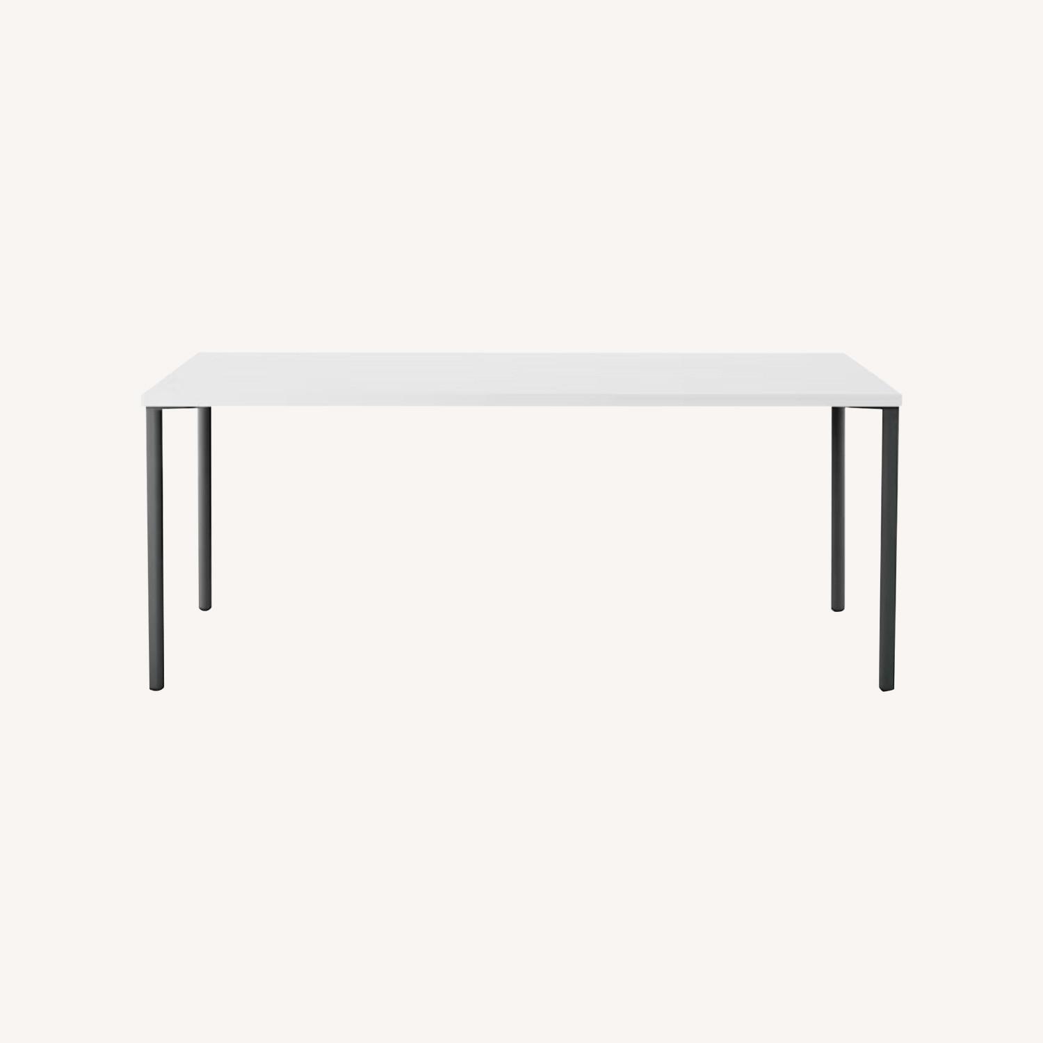 Seller's Notes:Herman Miller OE1 Table in white, sold by Design Within Reach. This sleek and minimalist desk features a durable laminate top and teardrop-shaped metal legs, which can be easily removed with included hardware for transport or storage. A versatile and modern addition to any workspace.