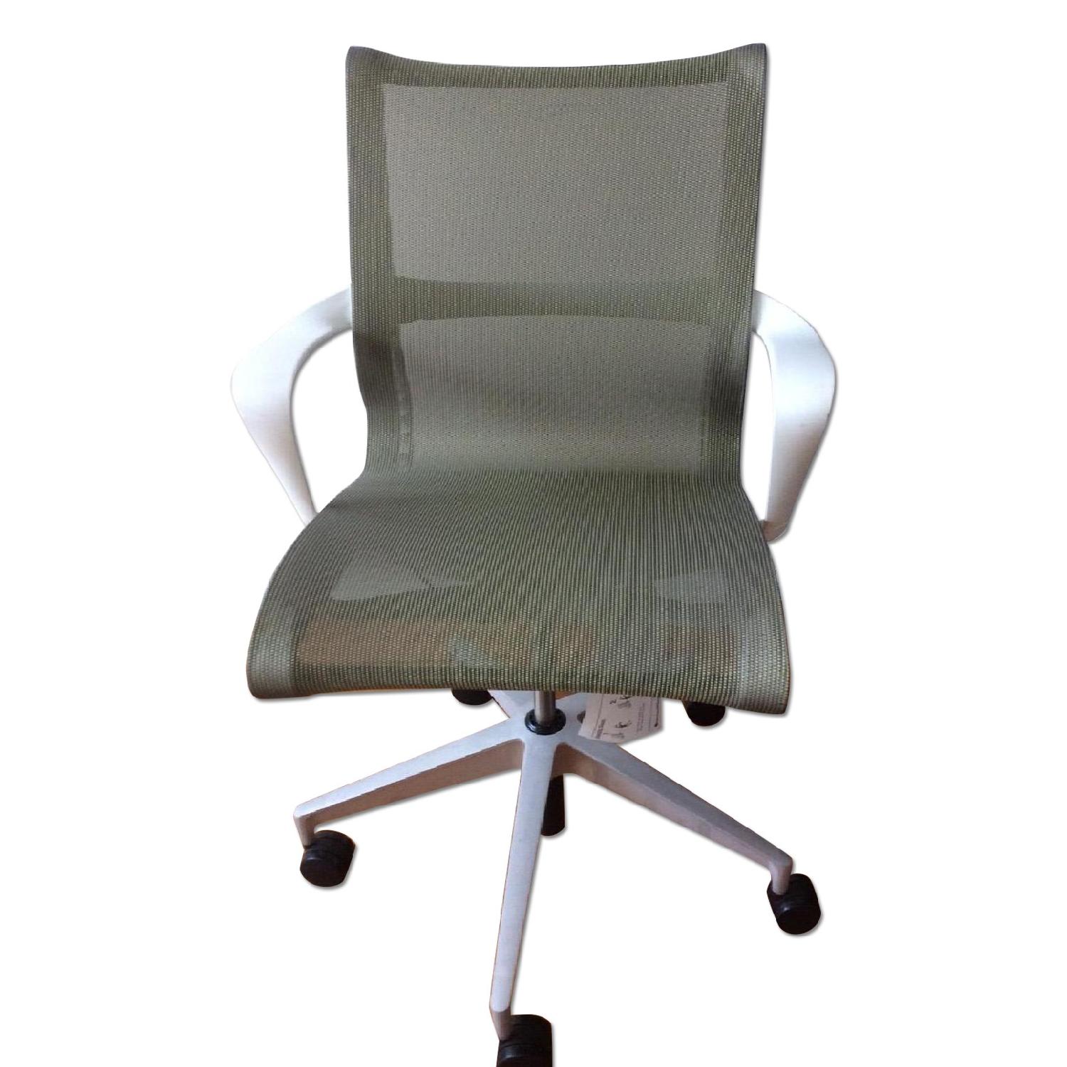 Seller's Notes:Herman Miller setu chair, 5-star base rolling swivel chair; "elastomeric" woven green fabric seat and back; white frame. Base, 27" D x 27" W Chair: 24" W (outside arms) x 23" D (front seat to outside backrest) x37" H (top of backrest). Inside of seat: 19" W x 16.5" D