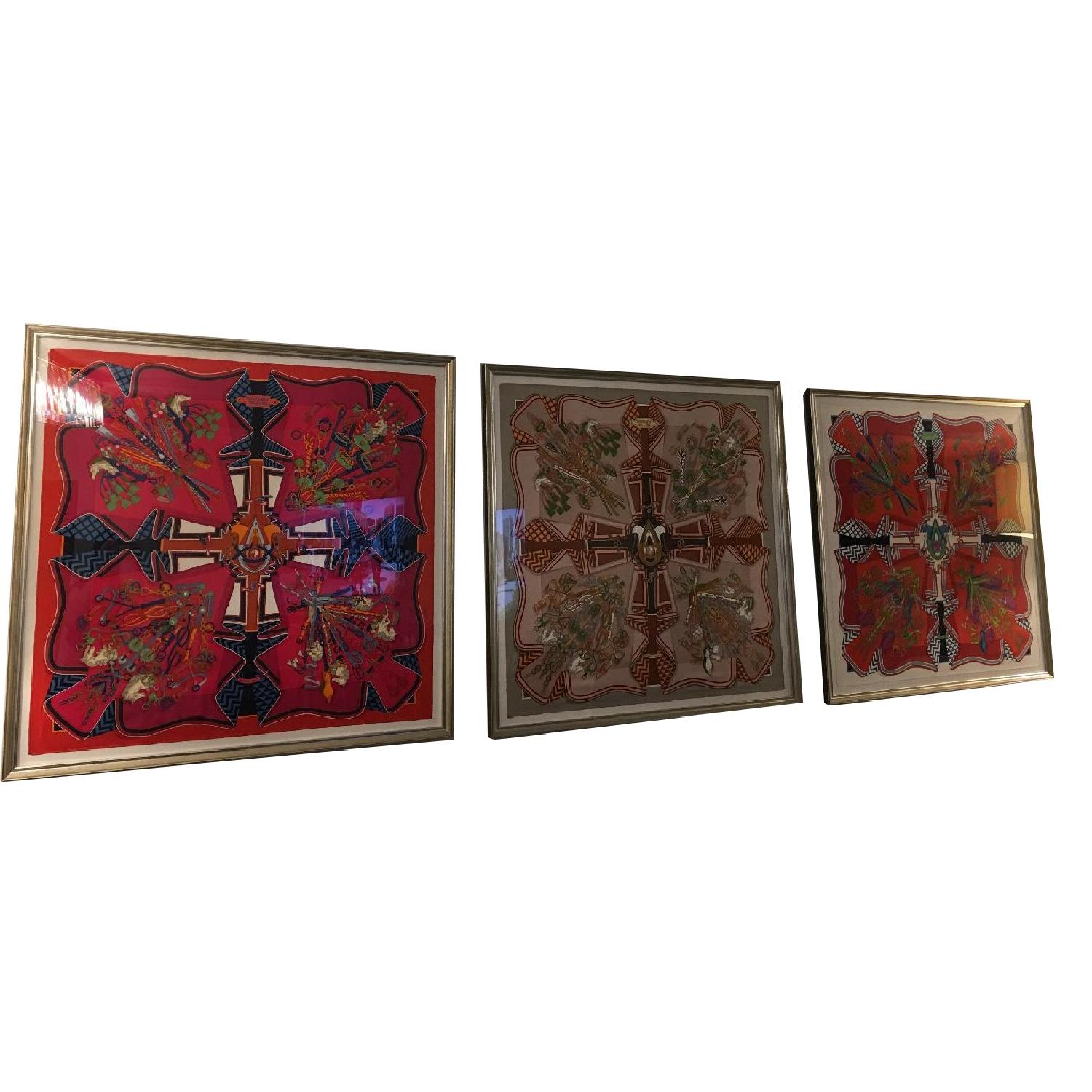 Seller's Notes:Gorgeous!! This Hermès Bouquets Selliers Silk Scarf is a brightly colored treat for the senses! Made of 100% silk, it depicts bouquets made of horse paraphernalia—stirrups, straps, curb chains, harnesses—instead of flowers! With Frame: 39 X 39 Scarf itself: 36x36 Scarf sewn onto matting board then framed.