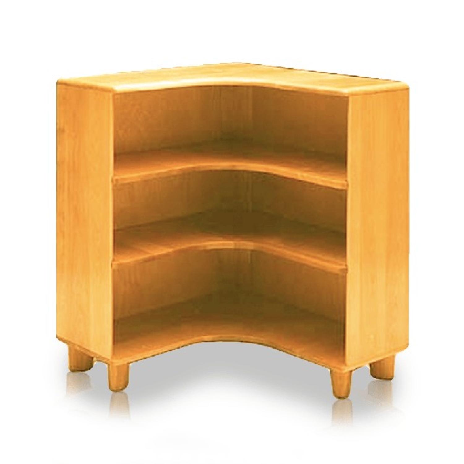 Seller's Notes:This is a corner book case from the revived Heywood-Wakefield company. We've had it a few years but it's in mint condition. Sells for $1,095 new (plus shipping). Here's from the company's website: In 1992, South Beach Furniture Company acquired the rights to the Heywood-Wakefield name. After quickly learning just how in demand vintage HW pieces were, production began on new pieces that remained true to the style, quality, and values of the original company. Today's Heywood-Wakefield is dedicated to preserving the legacy of the name and its famous pieces while incorporating new technology and contemporary tastes, allowing new generations to fall in love with a classic look from a classic company. A Few Words About Heywood-Wakefield Manufacturing All of today's Heywood-Wakefield furniture is American-grown and American-made from 100 percent Northern Yellow Birch, the same wood used for the company's highly-sought vintage furniture. We acquire our lumber from environmentally responsible tree farms in New Hampshire, where at least one tree is planted for each one harvested. Because our current finish is lighter and more transparent than the original, we now use an even higher grade of lumber for many furniture components for the most appealing natural look. Our furniture is made of solid wood. We don't use veneer, and particle board or plywood are only used in a very few instances for minor features, namely drawer dividers and backings for case goods. Strength and durability are ensured by cutting individual furniture components from a single piece of hand-selected lumber and by only using the sturdiest reinforced joining methods. Today's Amber finish is lighter than the original Wheat and Champagne finishes. It was specially designed for us to recreate the look of vintage HW furniture that has been stripped and refinished in a natural color. It is Kemvar, a newer finishing technology that provides superior protection to the older Duralac finishes. Many of today's pieces are still finished by hand, just as the vintage pieces were.