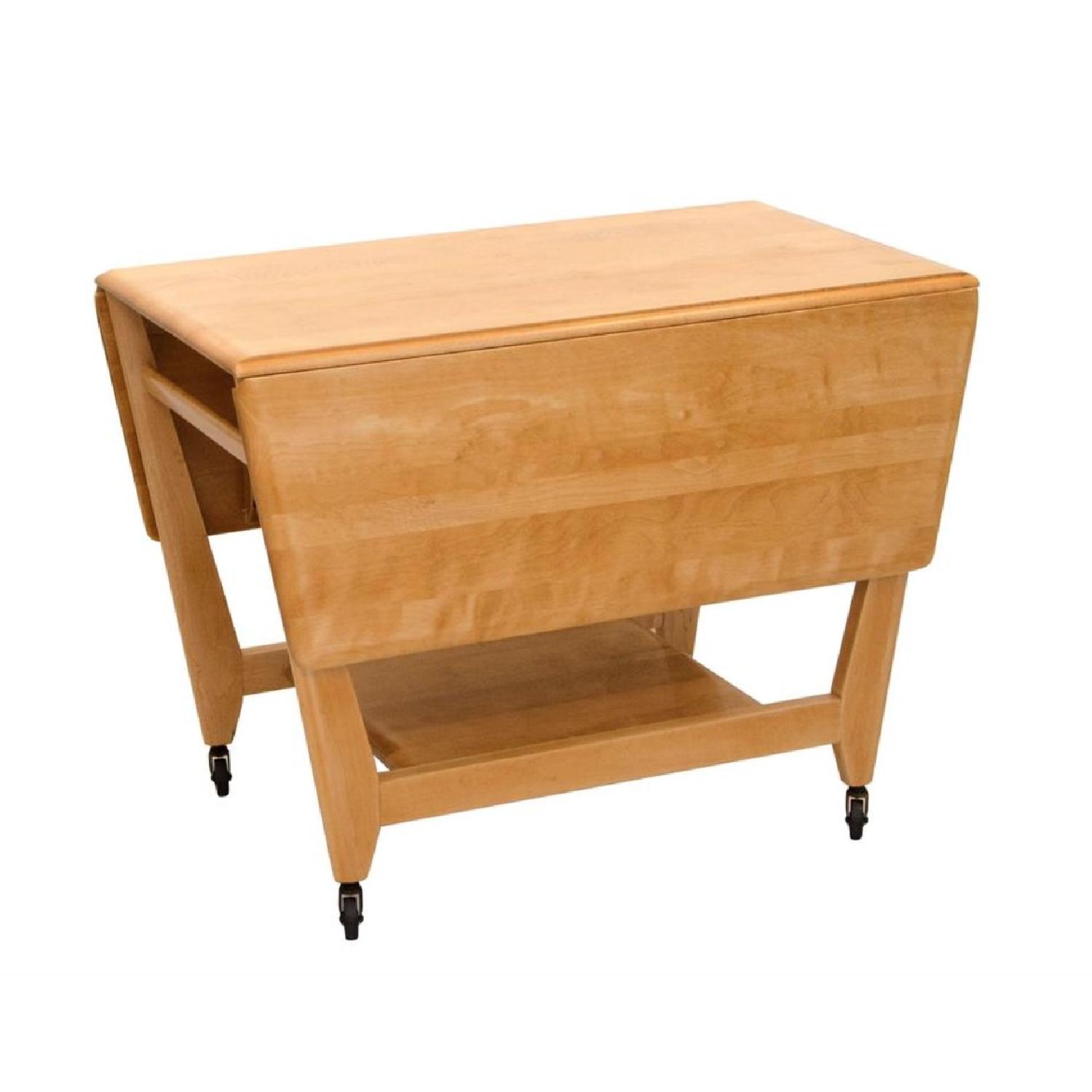 Seller's Notes:Feel free to make me an offer! This extremely rare, functional, and elegant mid-century modern table was produced for only one year, 1951-52. It bears the distinctive Heywood Wakefield eagle logo introduced in 1949, and has all the hallmarks that set this maker apart from the rest of the crowd. It can be used as a desk, table, or shelf. It has two folding wings with a shelf underneath. With clean geometric lines that recall the Art Deco movement, this beautiful "Streamline Modern" table exemplifies the best of both form and function, and is perfect for a New York apartment. Multipurpose serving cart for use as a bar cart, a serving cart for large dinners, a breakfast table for two, or an extra table for the kids at large dinner gatherings. Drop leaves are well supported with slide out wooden supports. Roomy lower shelf. The drop leaves also have a nice angular design. Cart fitted with ball-bearing caster wheels. Manufactured for only one year, 1951-1952. Table is 38" by 20" and 28" tall with leaves collapsed.