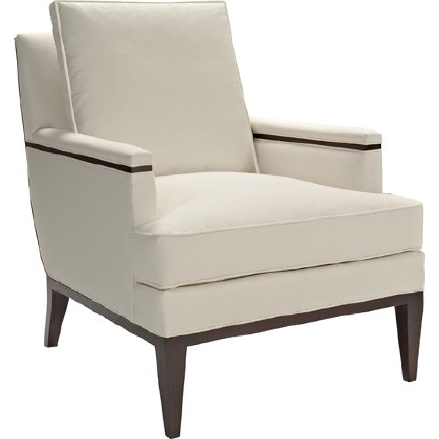 Seller's Notes:Sculptural exposed wood frame is accentuated by elegantly slender mahogany trim surrounding the base, arm and outback. Single spring down seat cushion and blend down back cushion. Inner seat area 15.5"h x 21"w x 21" d