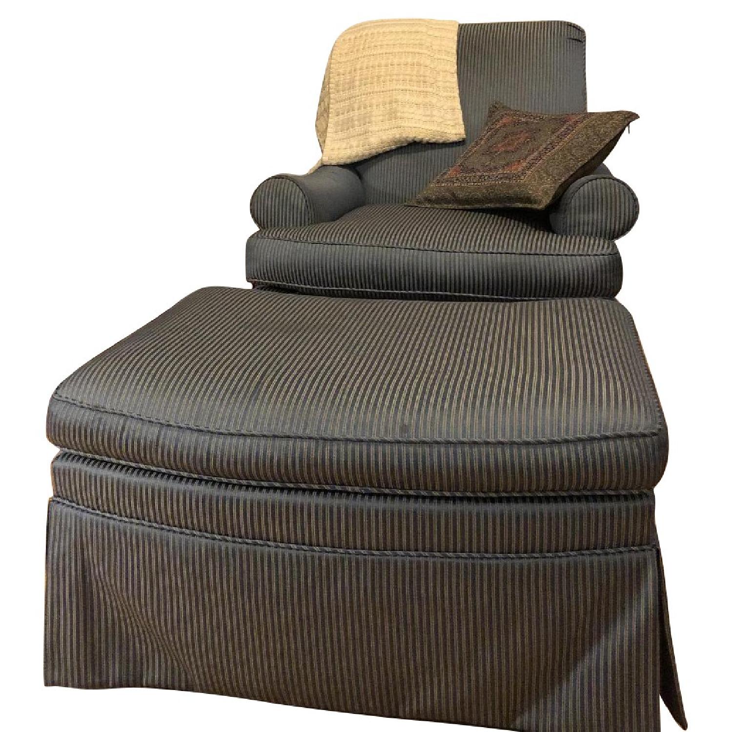 Seller's Notes:Super comfortable armchair lounge chair with a matching ottoman in a light blue stripe fabic. Perfect chair to set next to a window and read a good book.