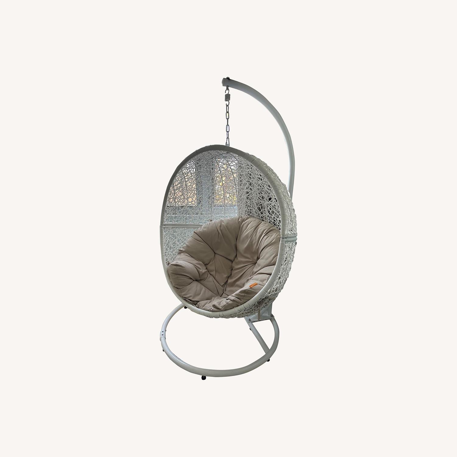 Seller's Notes:This beautiful indoor/outdoor swing chair has been very gently used only indoors. It was bought as a nursing and reading nook and is in great condition. The frame is white steel and ratten and the cushion is weather proof polyester in mocha.