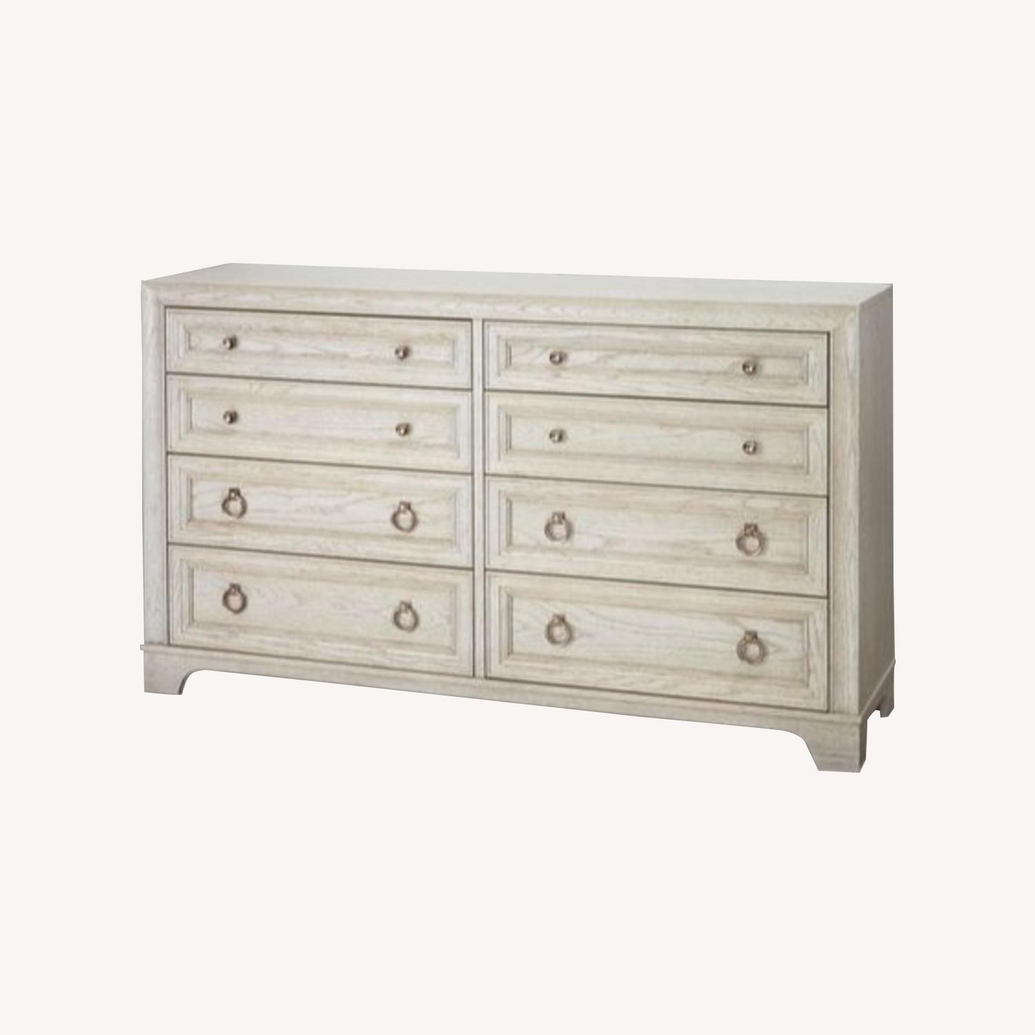 Seller's Notes:They hardly make them like this anymore. This is a stunning and very sturdy dresser with all the bells and whistles. The finish is a beautiful distressed light greige. The drawers all have dove tail joinery except the top left drawer which has a drop front for you to tuck in a cable box or other items. The cedar lined bottom drawers are deep and perfect for winter sweaters or blankets. I can no longer find this for sale anywhere but I originally bought it from Joss+Main for $3k. Full disclosure there is some general small wear on some corners as well as faint discoloration on the top; given the general distressed look it blends in nicely but have a look at the last photo. There is one drawer that the railing is wobbly and just needs to be tightened/screwed in a bit more. This is a truly beautiful piece, sturdy and heavy. Does not feel flimsy or cheap. Selling because I am re-decorating this room.