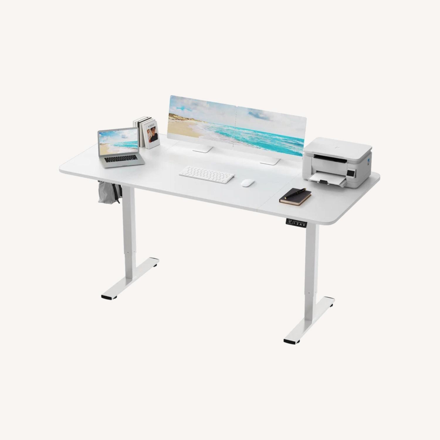 Seller's Notes:Excellent like new condition white standing desk with electric motor for automatic rise and lower of desk as well as an added two upgrades-- installed drawer for supplies and rack for cords and cables at the back of desk to keep everything tidy. This desk is in terrific shape with just one small scratch smaller than a dime (see photos). Love it and the ease of use, but need something a bit smaller for my space. Can be disassembled to transport, but also easy to keep assembled and carry in an SUV like Uber XL which is how we transported it. Measures 47.5 L x 30 W with adjustable rise.