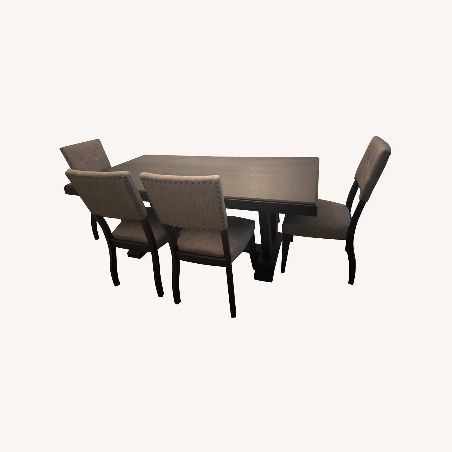 Seller's Notes:Urban rustic styling and chic tailored touches combine to create the Hill Creek dining room. Crafted with wood solids and oak veneers, the collection has a rubbed black finish. Perfect for gathering family and friends, the 41 x 76 inch table features a plank style top and supportive trestle base. Wonderfully detailed side chairs feature tufted gray linen-style upholstery along with decorative nailhead trim. Includes: One Dining Room Table, Four Dining Room Chairs, Bench This casual choice accommodates six people comfortably thanks to the padded seat upholstered in chic gray linen-style fabric on chairs and bench. The base and tapered legs are made with wood solids and oak veneers in a rubbed black finish.
