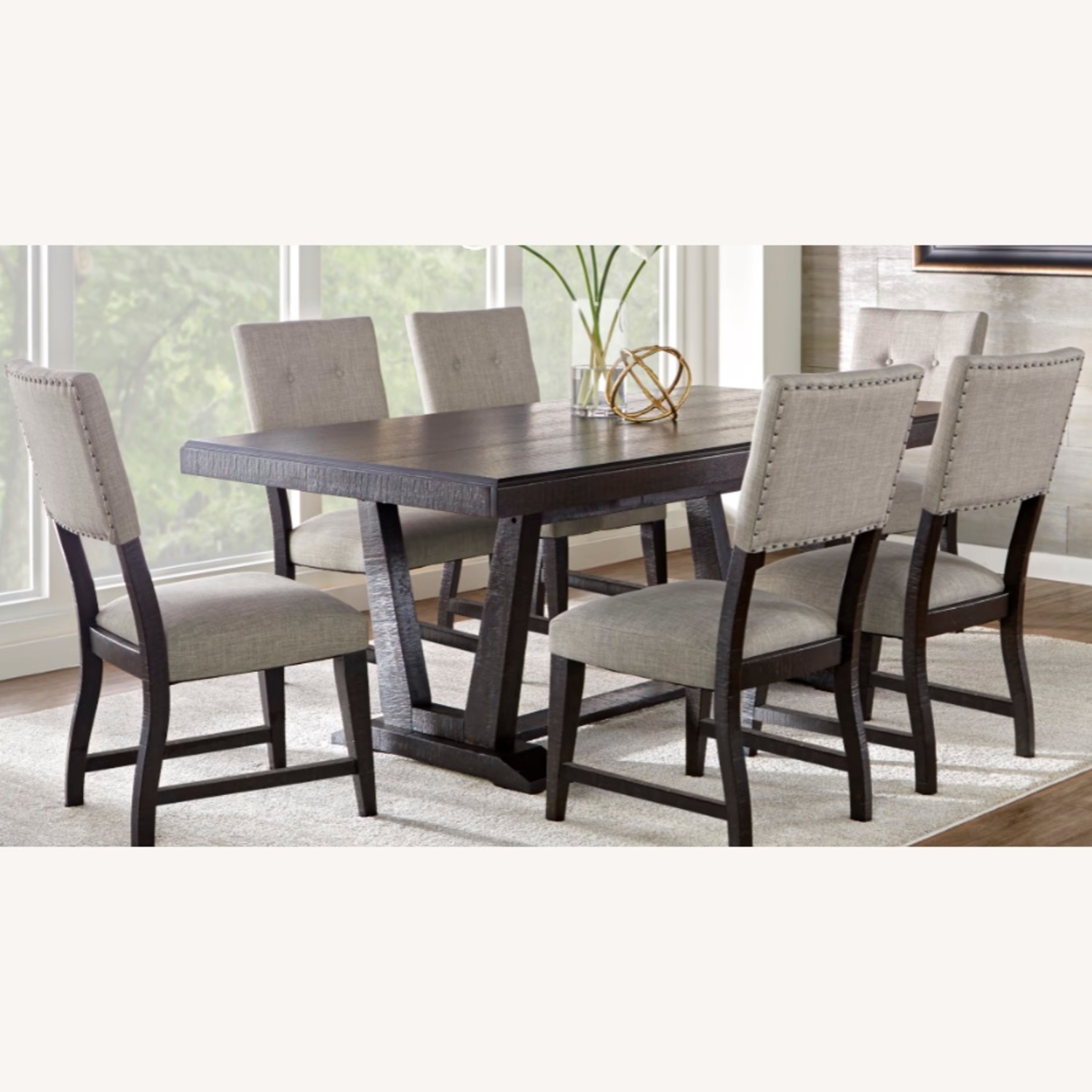 Urban rustic styling and chic tailored touches combine to create the Hill Creek dining room. Crafted with wood solids and oak veneers, the collection has a rubbed black finish. Perfect for gathering family and friends, the 41 x 76 inch table features a plank style top and supportive trestle base. Wonderfully detailed side chairs feature tufted gray linen-style upholstery along with decorative nailhead trim.