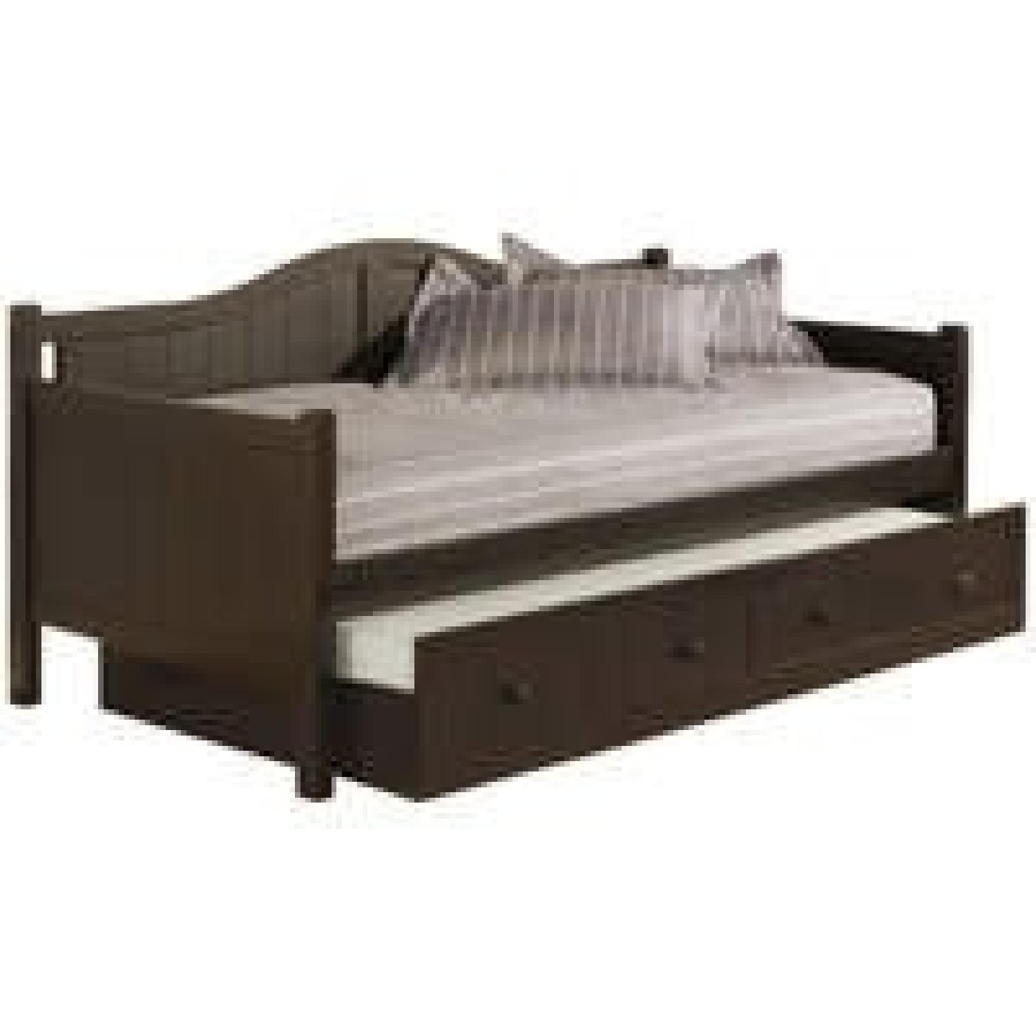 Seller's Notes:This item is brand new. We took it out of the box & set it up in our apartment and quickly realized our place is just too small for this piece of furniture. It’s never been used. The trundle could be used for a second twin mat. or for storage. Twin sized cushions not included.